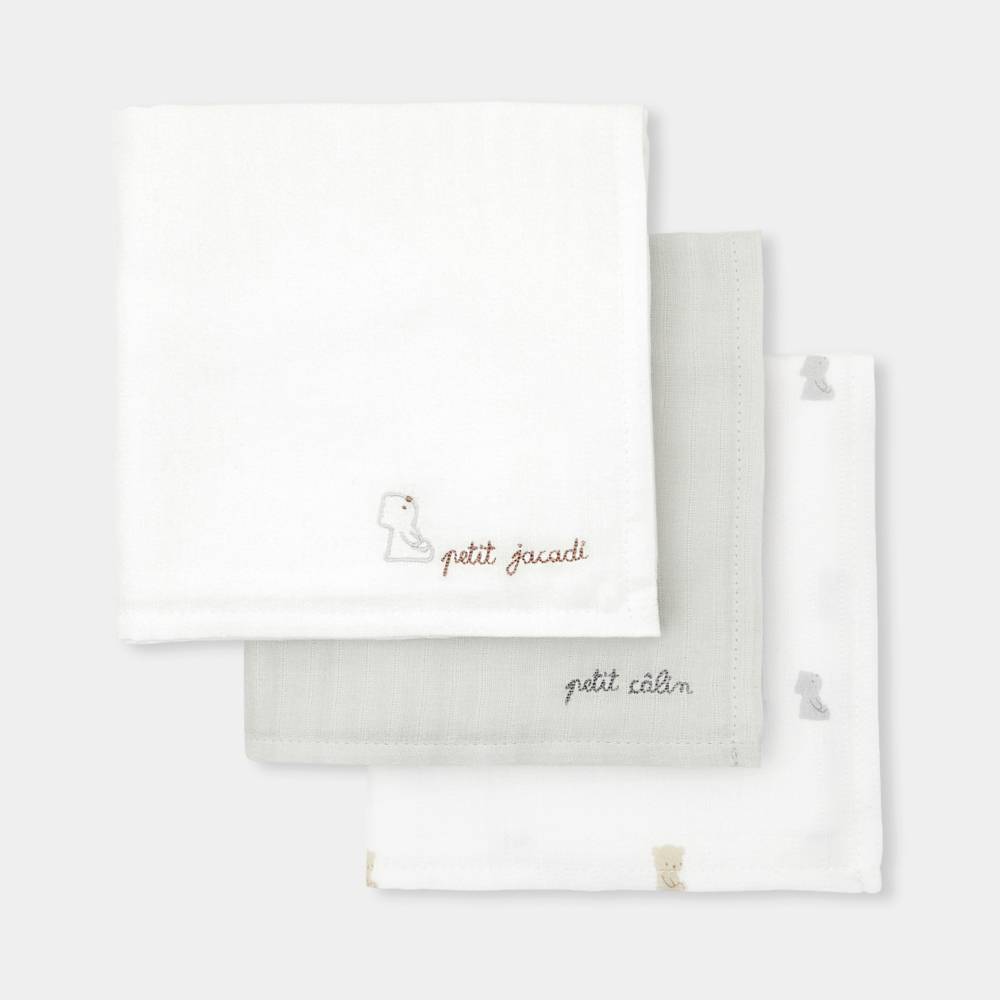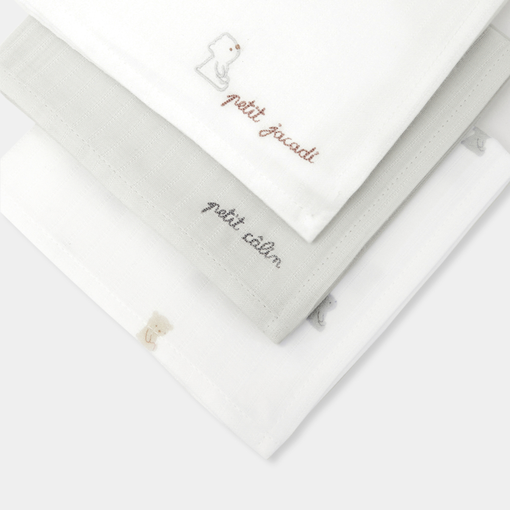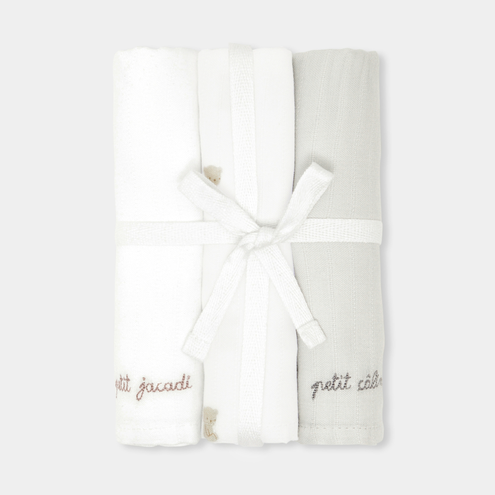 Bu pamuklu bezler ilk günden itibaren yanınızda olacak. Birinin üzerinde küçük oyuncak ayılar basılı, diğer ikisinin üzerinde ise işlemeler var. Omzunuza asarak yemek zamanlarında bebeğinizin kıyafetlerini koruyabilir veya altını değiştirmek için yere koyabilirsiniz, bu bezler günlük hayatınızı kolaylaştıracak.