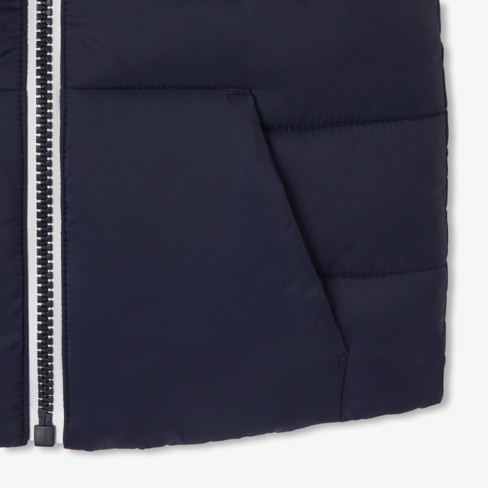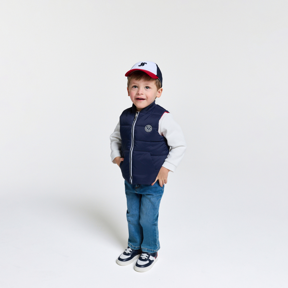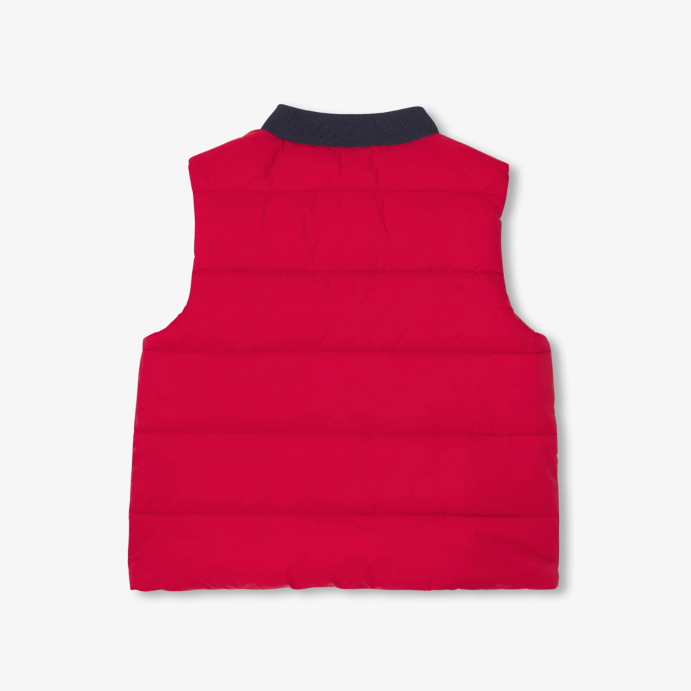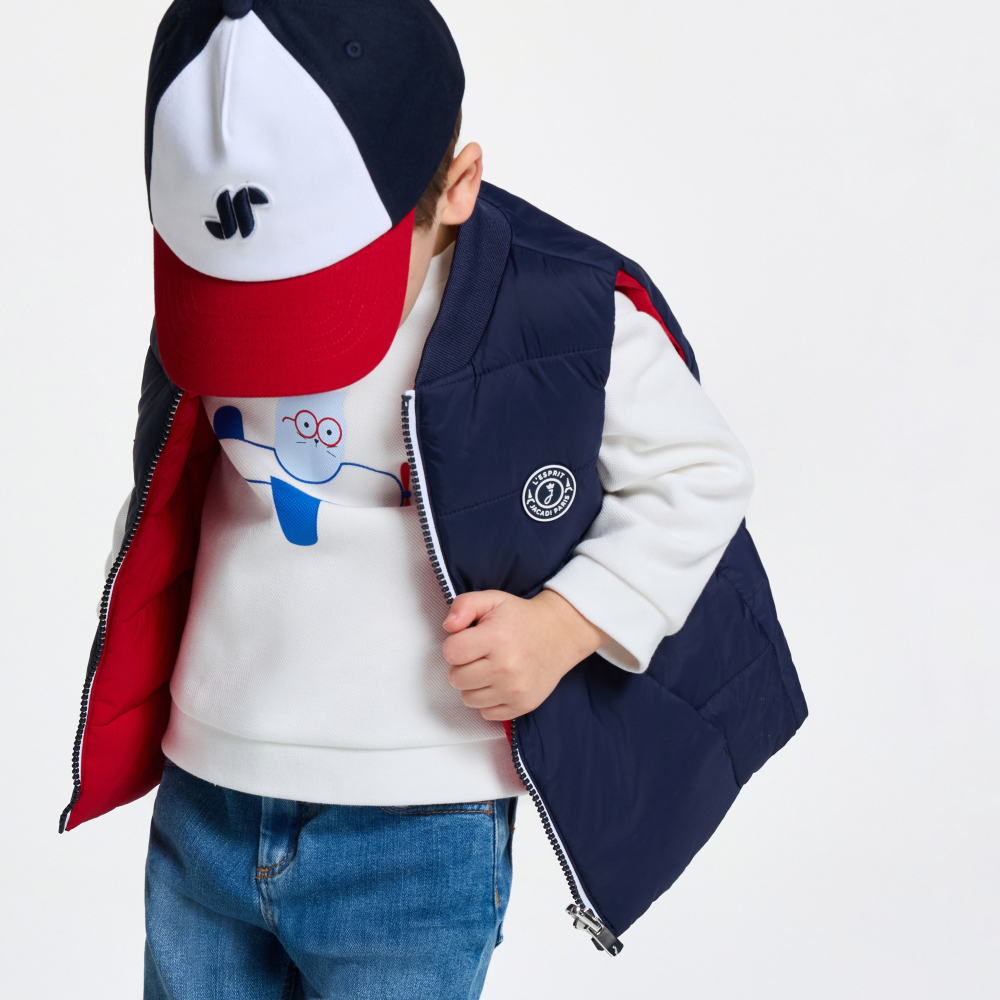 Fonksiyonel ve stil sahibi tasarımıyla öne çıkan bu çift taraflı bebek yelek, sezon başlangıcı için ideal bir parçadır. Teddy yakası ve göğüsteki arma detayıyla preppy ve sportif bir görünüm sunan model, lacivert veya kırmızı tarafıyla farklı kombinler oluşturmanıza imkân tanır. Sweatshirt veya kazakların üzerine giyilerek günlük stillere modern bir dokunuş katar.