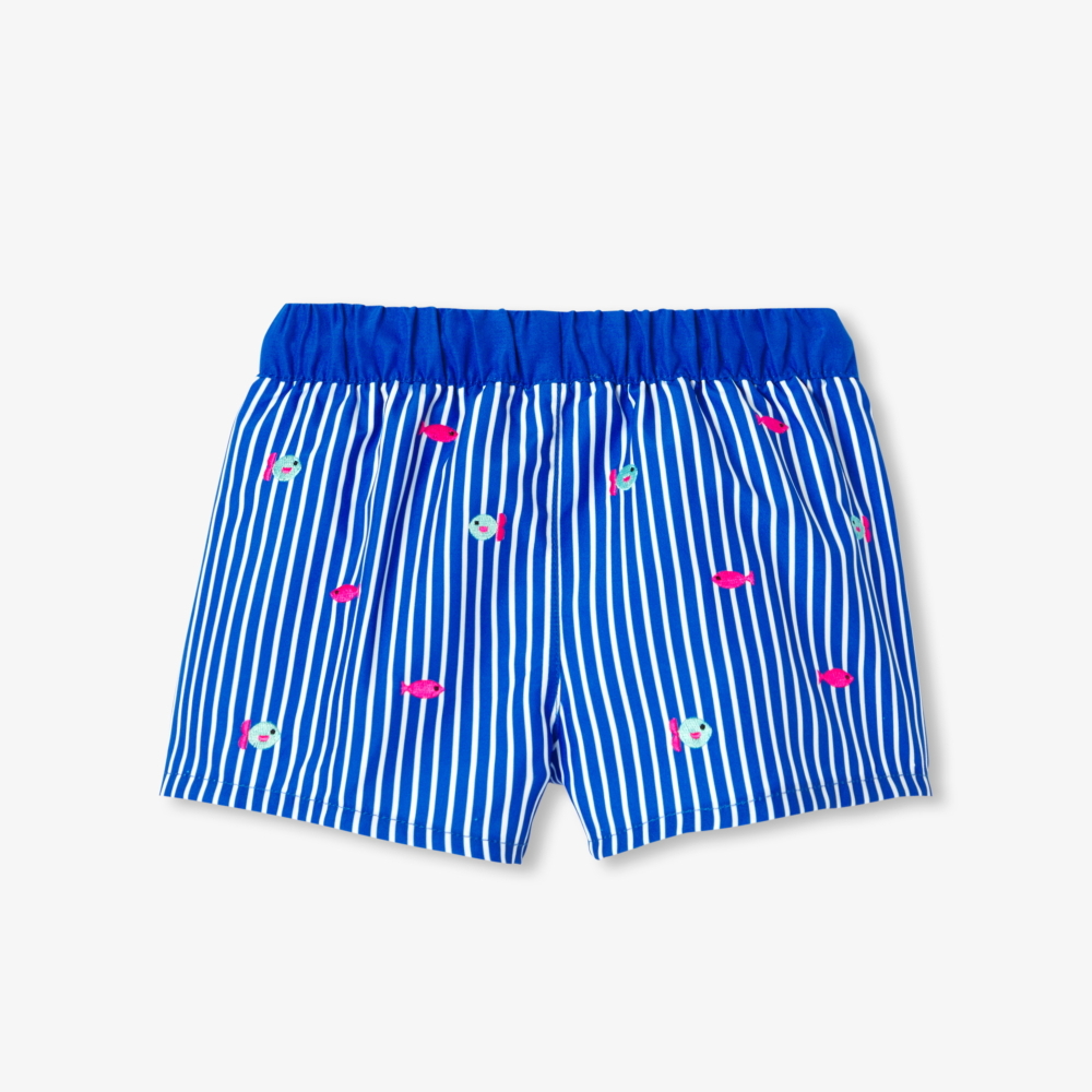 Mavi ve beyaz çizgileriyle öne çıkan bu bebek deniz şortu, renkli balık desenleriyle eğlenceli bir görünüm kazanır. Ayarlanabilir lastikli bel yapısı sayesinde kolay giydirilen model, yaz günlerinde konforlu ve pratik bir kullanım sunar.