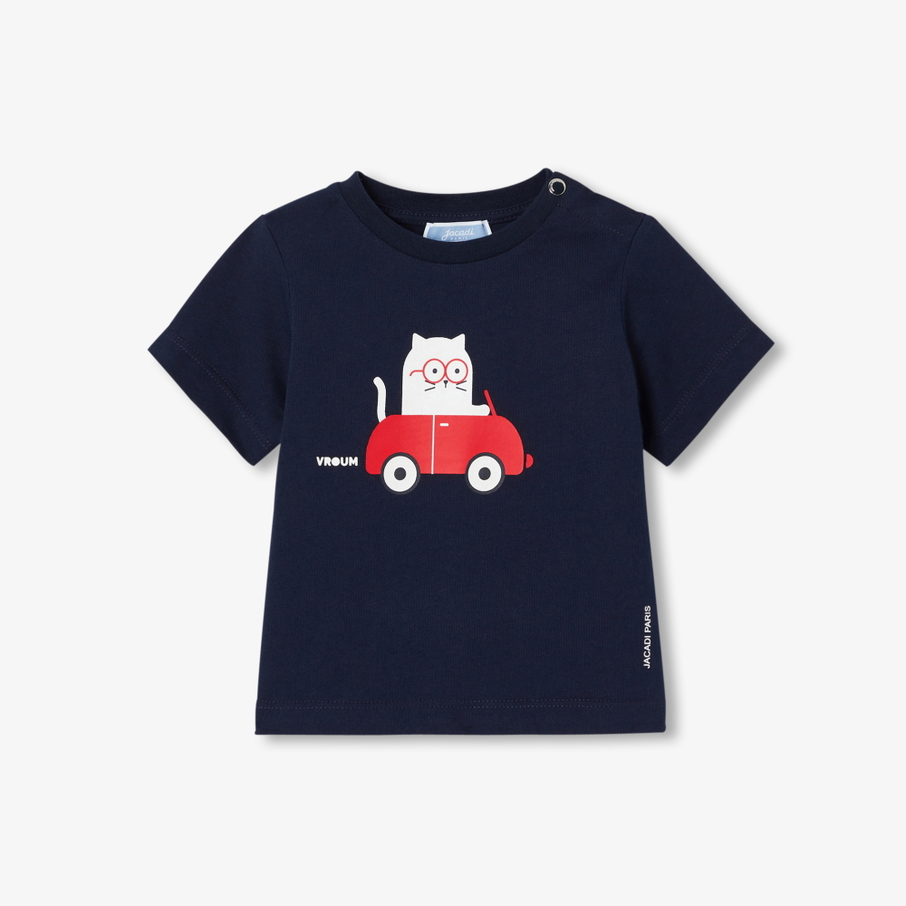 Günlük gardırobun vazgeçilmez parçalarından biri olan bu erkek bebek tişört, yumuşak pamuk kumaşıyla konfor sunarken eğlenceli tasarımıyla öne çıkar. Kırmızı yarış arabası kullanan kedi figürü, modele neşeli ve dinamik bir karakter kazandırır. Pantolon veya şortlarla kolayca kombinlenebilen bu model, günlük stilin tamamlayıcısıdır.