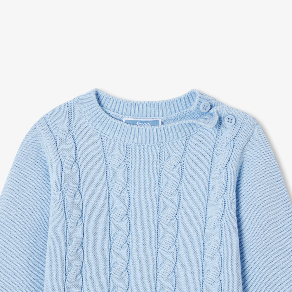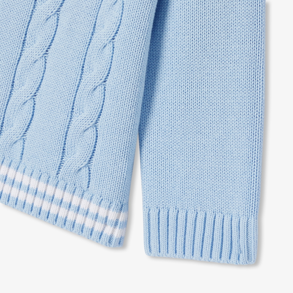 Klasik stilden ilham alan bu erkek bebek kazak, modern ve zarif bir görünüm sunar. Saç örgü triko dokusu ve çizgi detaylarıyla hareket kazanan model, omuz kısmındaki düğmeli kapaması sayesinde pratik bir kullanım sağlar. Şortlarla kombinlenerek ya da yaz akşamlarında omuzlara alınarak şık bir stil oluşturur.