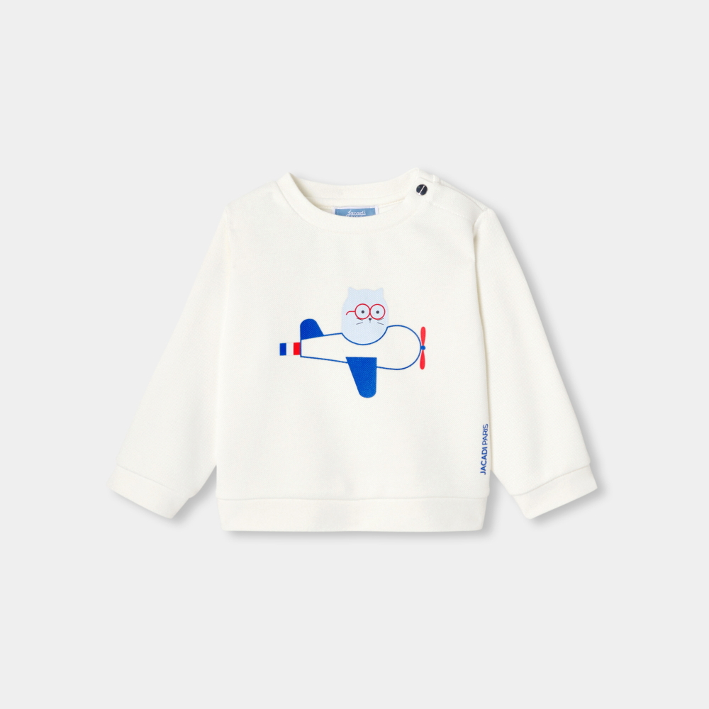 Yumuşak ve sıcak tutan fleece kumaşıyla tasarlanan bu erkek bebek sweatshirt, sezonun eğlenceli aviator kedi motifiyle öne çıkar. Omuz kısmındaki çıtçıtlı kapama detayı sayesinde kolay giydirilebilen model, kıvrılmış paça jean pantolonlar veya çizgili şortlarla kombinlenerek Fransız stilinden ilham alan şık bir görünüm oluşturur.