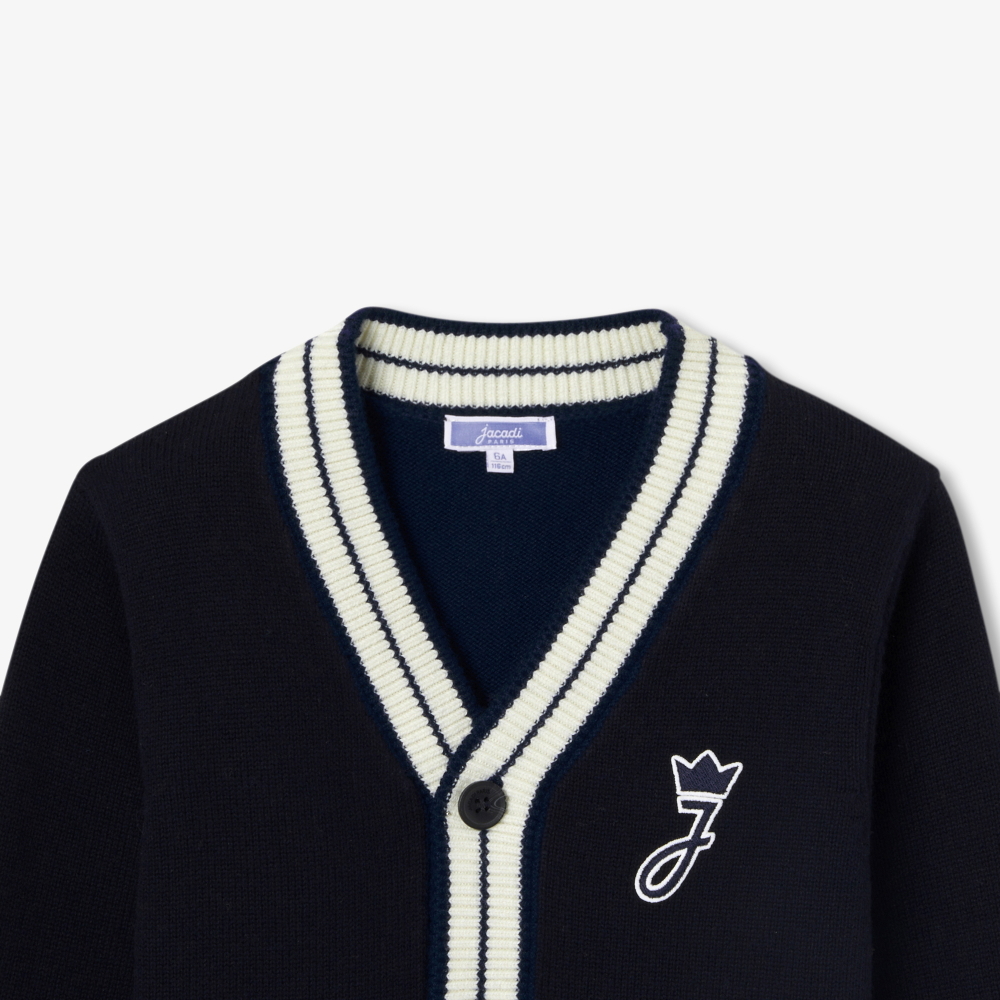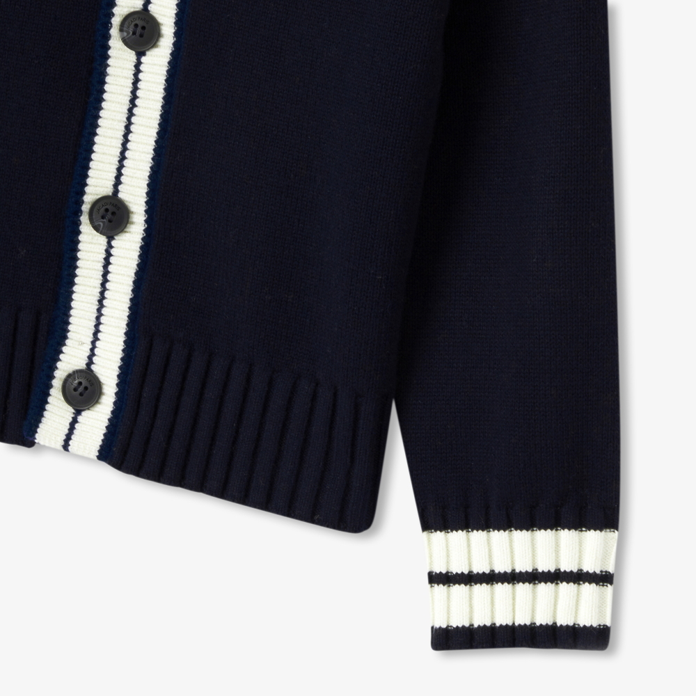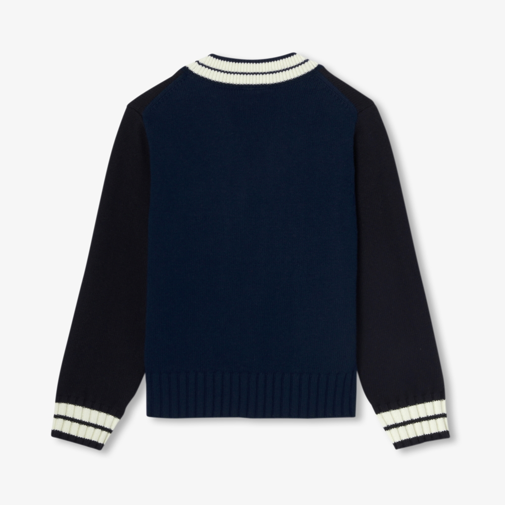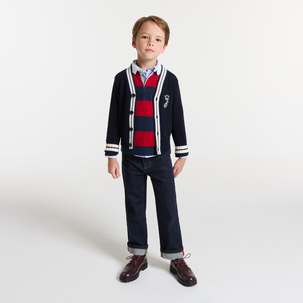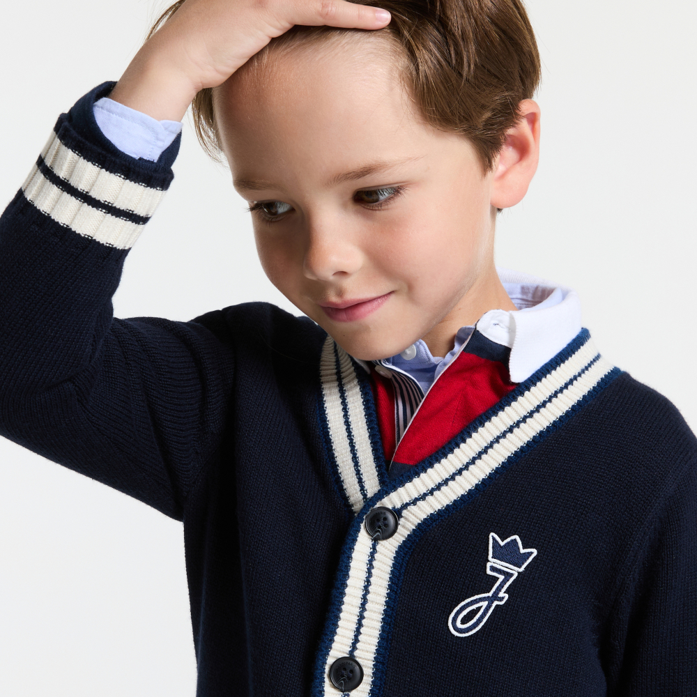 Klasik tarzı modern detaylarla buluşturan bu erkek çocuk hırka, preppy şıklığın en zarif halini yansıtır. Organik pamuk ve sorumlu üretim yün karışımından üretilen model, çizgili ribana detaylarıyla dinamik bir görünüm kazanır. Renk bloklu tasarımıyla dikkat çeken bu parça, tişört ve kadife pantolonlarla kombinlenerek şehirli bir stil yaratır.