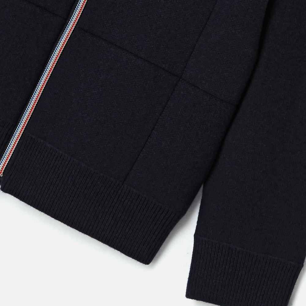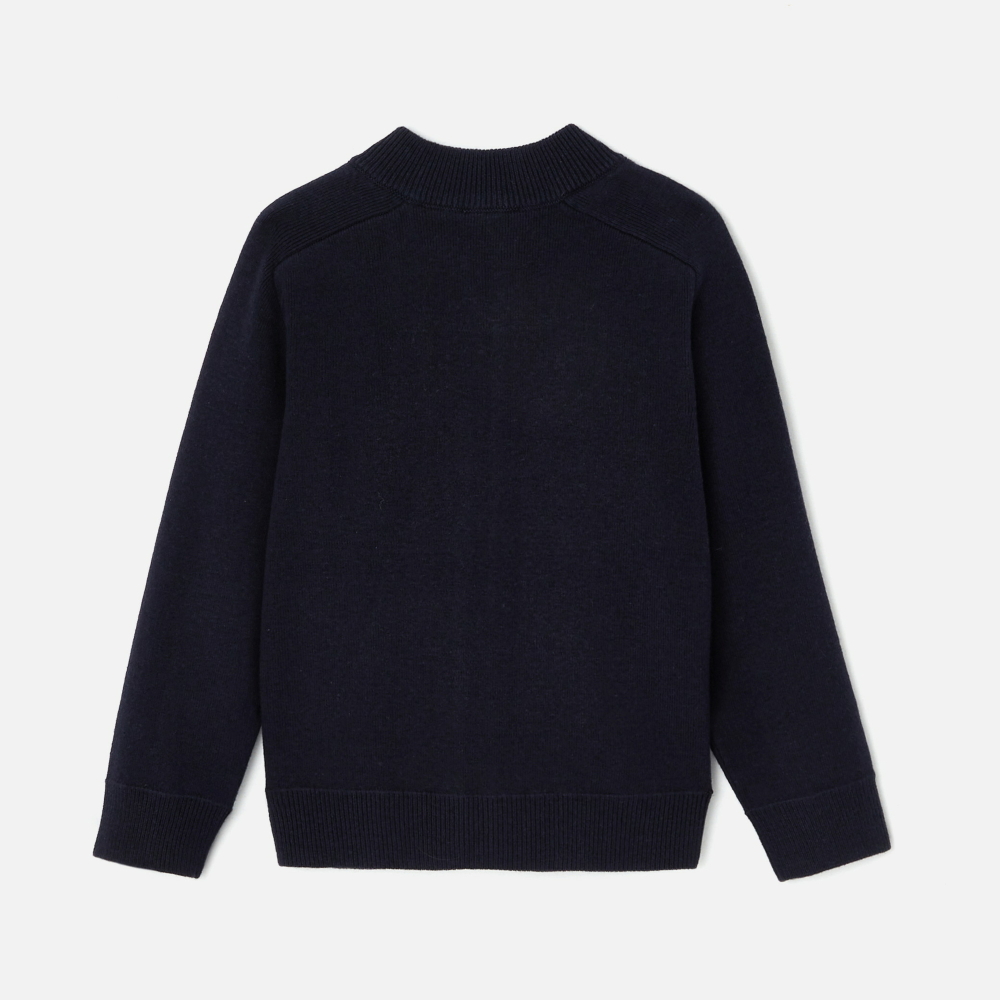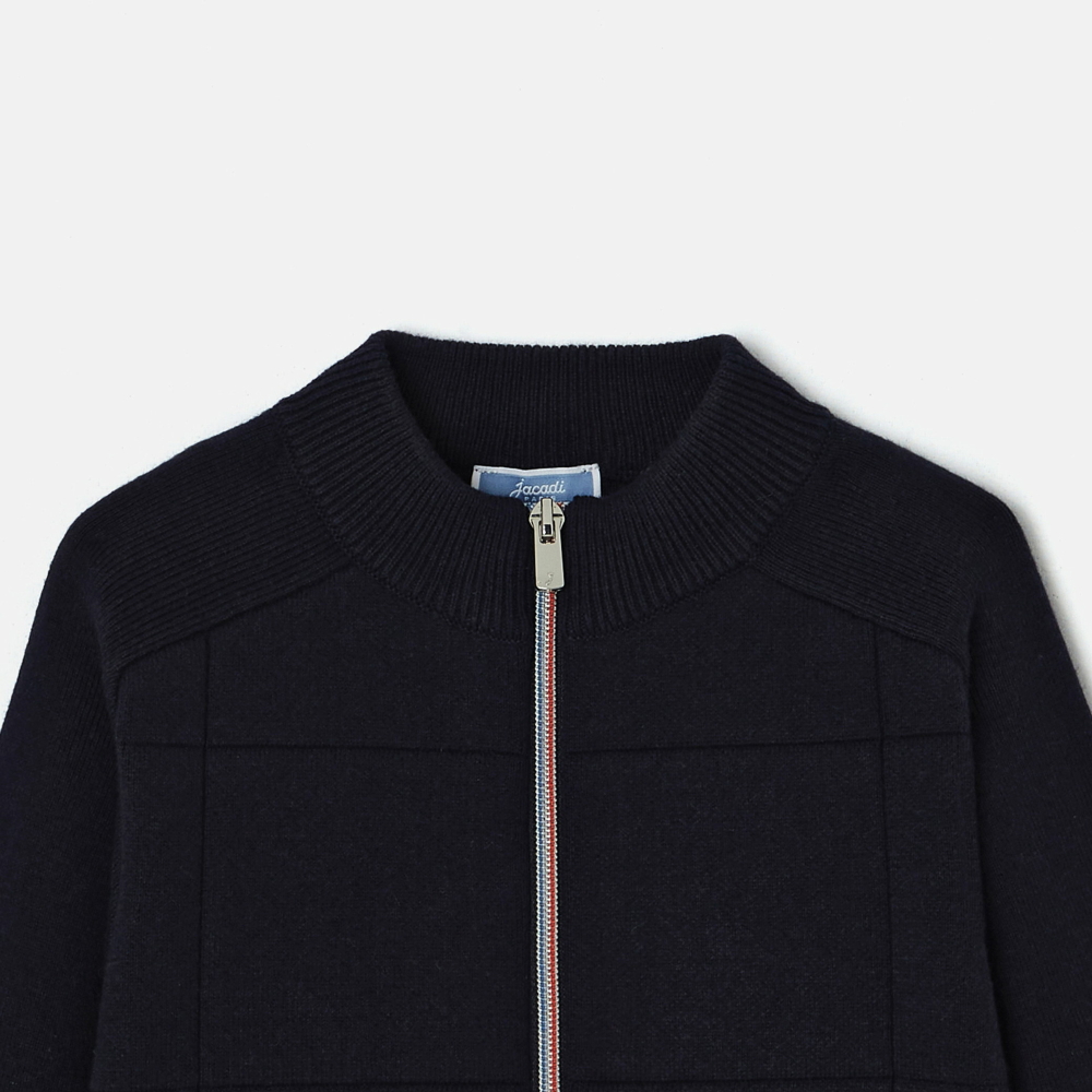 Jacadi, sonbahar sezonu için karmaşık örgüden yapılmış zarif lacivert renk bir hırka tasarladı. Organik pamuk ve çevre dostu yünden üretilmiş hırka, şık ve modern bir his için zarif bir kareli desene sahiptir. Fermuarı sayesinde kolayca giyilebilen bu hırka, pazar günleri brunch için bir polo tişört ve bir pantolon ile harika bir uyum oluşturur.