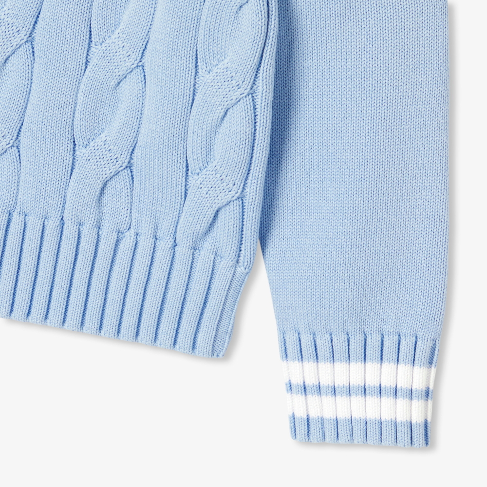 Jacadi gardırobuna iddialı bir dokunuş katan bu çocuk kriket stili kazak, kalın örülmüş pamuk ve burgu örgü deseniyle dikkat çekiyor. İkonik çizgili V yaka ve manşet detayları ile birlikte göğüste işlenen “J” rozeti, preppy stilin zarafetini yansıtıyor. Günlük kombinlere enerji katan, kolay giyilen bir parça.