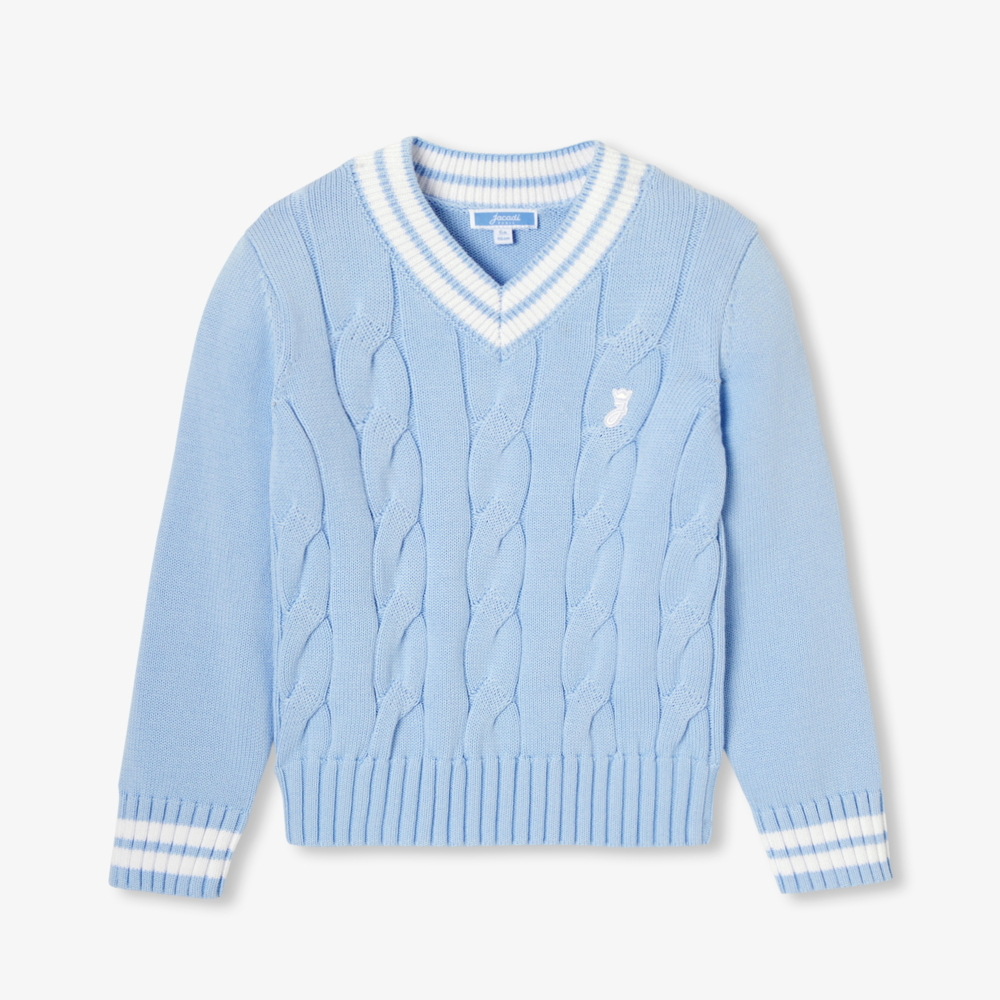 Jacadi gardırobuna iddialı bir dokunuş katan bu çocuk kriket stili kazak, kalın örülmüş pamuk ve burgu örgü deseniyle dikkat çekiyor. İkonik çizgili V yaka ve manşet detayları ile birlikte göğüste işlenen “J” rozeti, preppy stilin zarafetini yansıtıyor. Günlük kombinlere enerji katan, kolay giyilen bir parça.