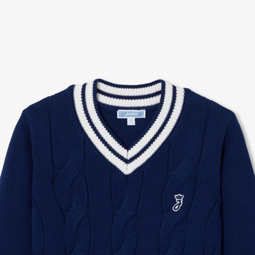 Jacadi gardırobuna iddialı bir dokunuş katan bu çocuk kriket stili kazak, kalın örülmüş pamuk ve burgu örgü deseniyle dikkat çekiyor. İkonik çizgili V yaka ve manşet detayları ile birlikte göğüste işlenen “J” rozeti, preppy stilin zarafetini yansıtıyor. Günlük kombinlere enerji katan, kolay giyilen bir parça.