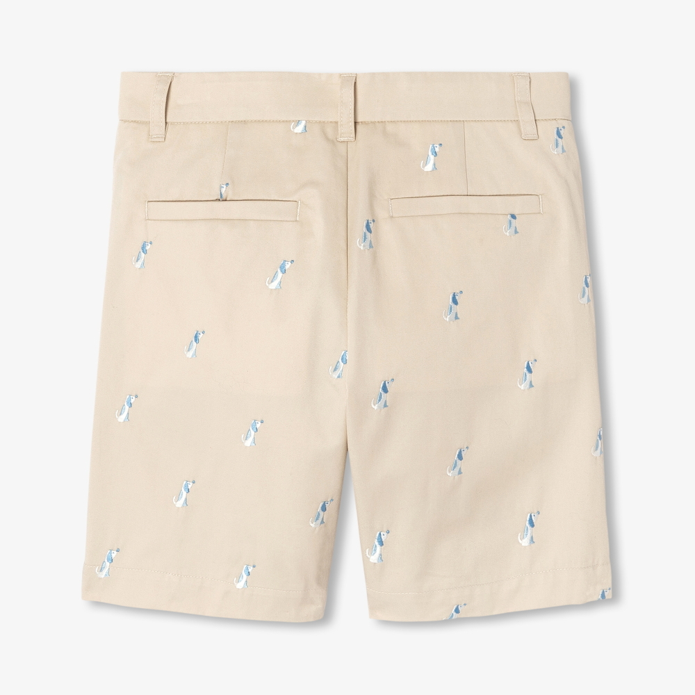 Yaz gardırobunun klasik parçalarından biri olan bu erkek çocuk bermuda şort, kağıt dokunuşu (paper touch) efektli pamuk twill kumaşı ve tüm yüzeye yayılan köpek nakışlarıyla öne çıkar. Konforlu yapısı ve kusursuz kalıbıyla gün boyu rahat bir kullanım sunan model, polo tişört ve tekne ayakkabılarla kombinlenerek şık bir görünüm oluşturur.