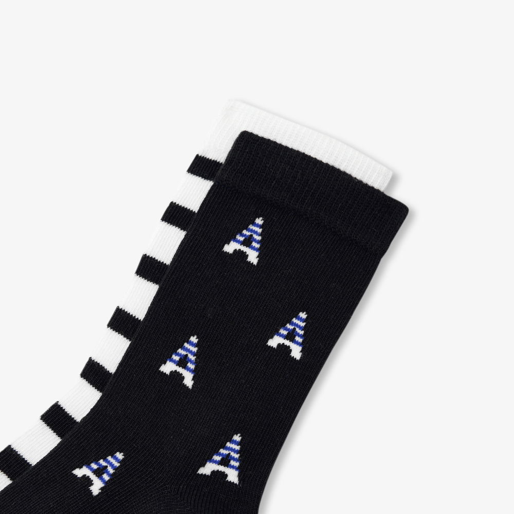 Paris şıklığını en ince detayına kadar yansıtan bu erkek çocuk çorap seti, iki farklı tasarımı bir arada sunuyor. Bir çift çizgili desenle öne çıkarken, diğer çift intarsia tekniğiyle işlenmiş Eyfel Kulesi motifiyle Fransız stiline eğlenceli bir dokunuş katıyor. Yumuşak dokulu örme yapısı sayesinde kolayca giyilir ve gün boyu konfor sağlar.