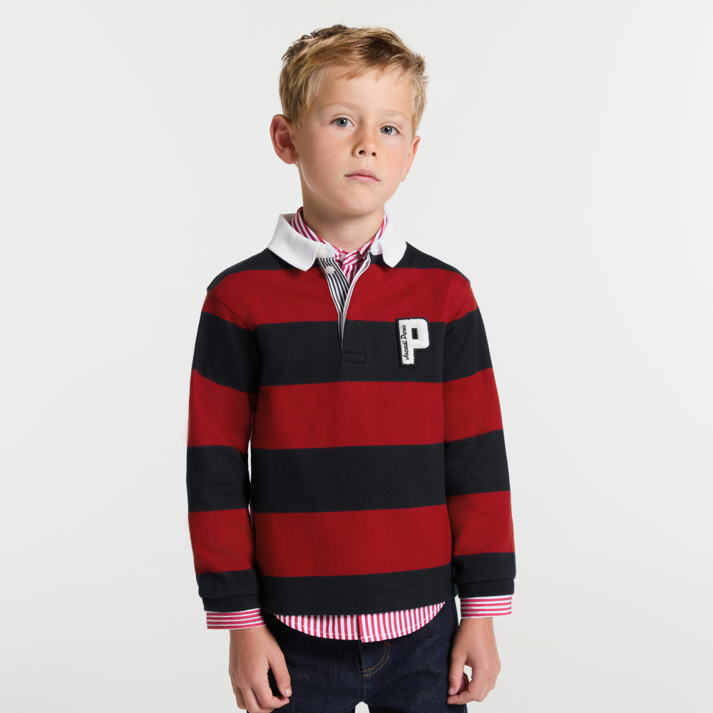 Kampüs stilinden ilham alan bu erkek çocuk rugby polo, kış ayları için kalın pamuklu jarse kumaştan tasarlanmıştır. Geniş çizgili deseni, kontrast yakası ve göğsündeki arma detayıyla klasik ve modern görünümü bir araya getirir. Hem şık hem rahat olan bu model, twill pantolon ve botlarla kombinlendiğinde şehirli bir tarz yaratır.
