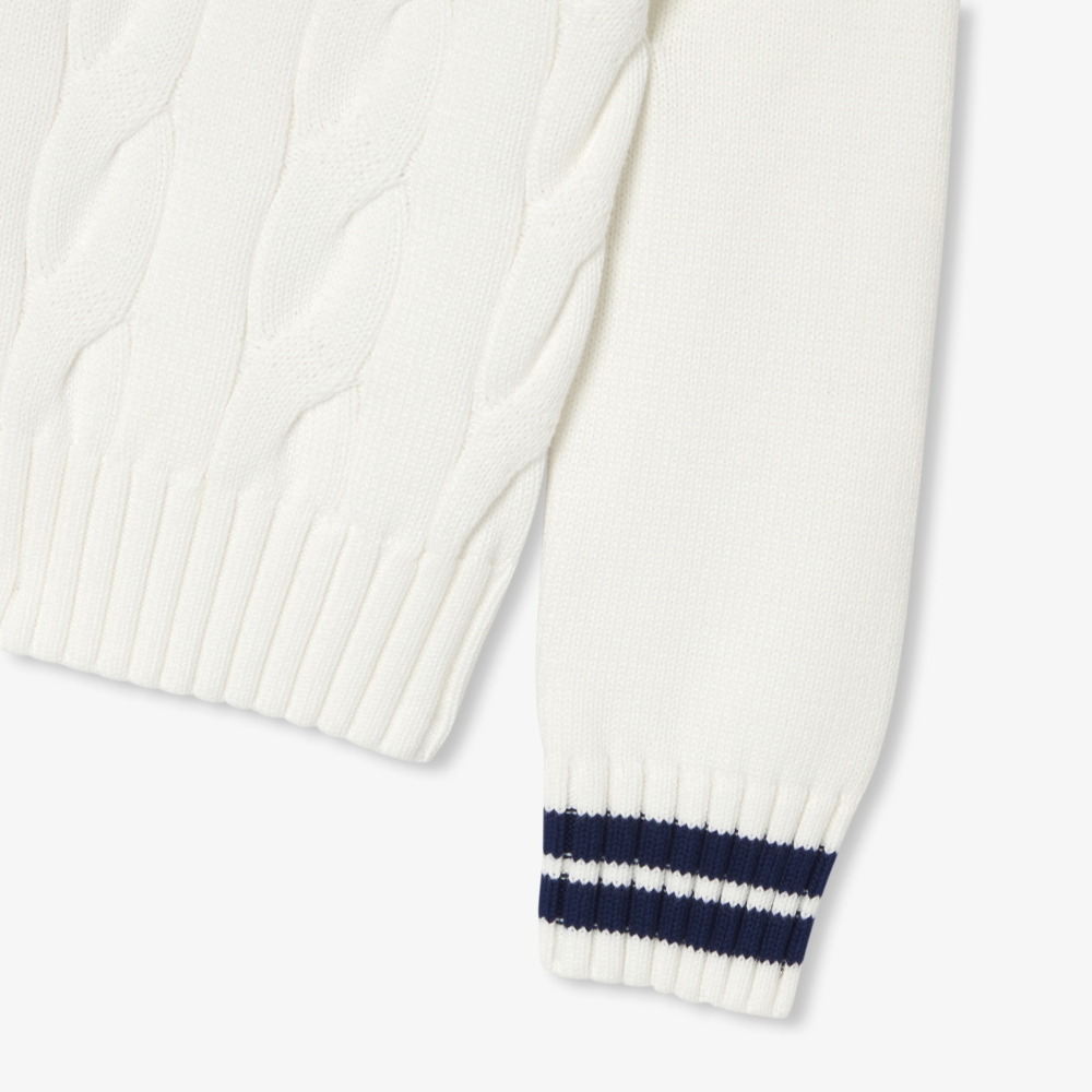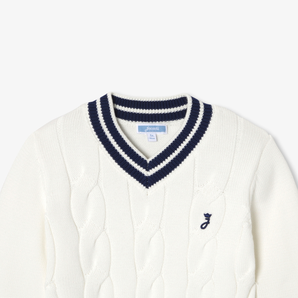Kolej stilinden ilham alan bu çocuk kazağı, spor ve klasik detayları bir araya getirir. Kalın dokulu triko yapısı, V yaka kesimi ve kontrast renkli çizgili yaka ile manşetleriyle dikkat çeken model, saç örgü deseniyle zamansız bir görünüm sunar. Şort ya da pantolonlarla kolayca kombinlenerek günlük şık bir stil oluşturur.