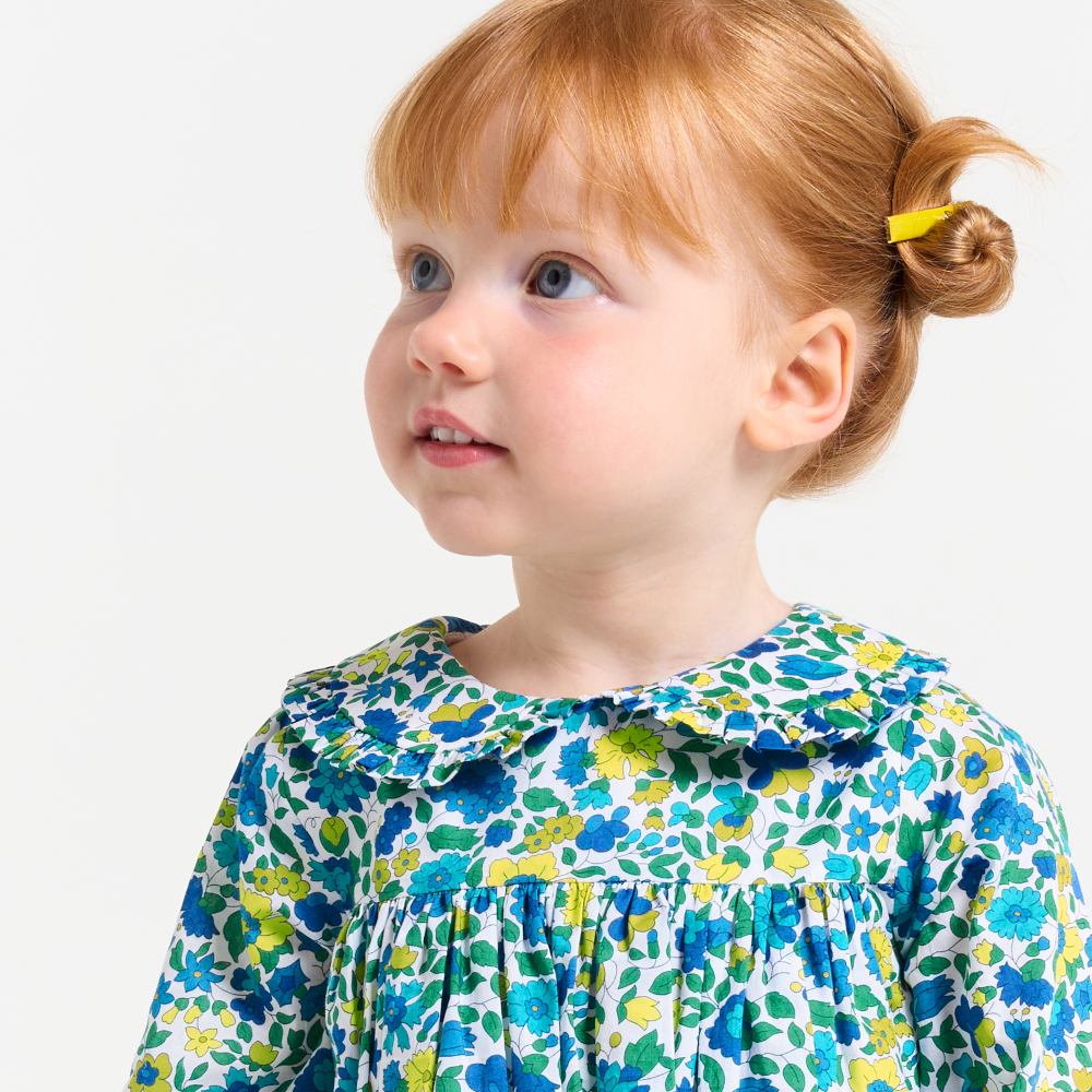Jacadi gardırobunun ikonik parçalarından Liberty kumaştan üretilen bu bebek elbisesi, sonbahar için kadife versiyonuyla karşımıza çıkıyor. Fırfırlı Peter Pan yakası, büzgülü askılı bel kısmı ve bilezik kolları, bu şık ve çiçekli parçayı, İngiliz paltosuyla kombinleyerek özgün bir silüet yaratmaya yardımcı oluyor.