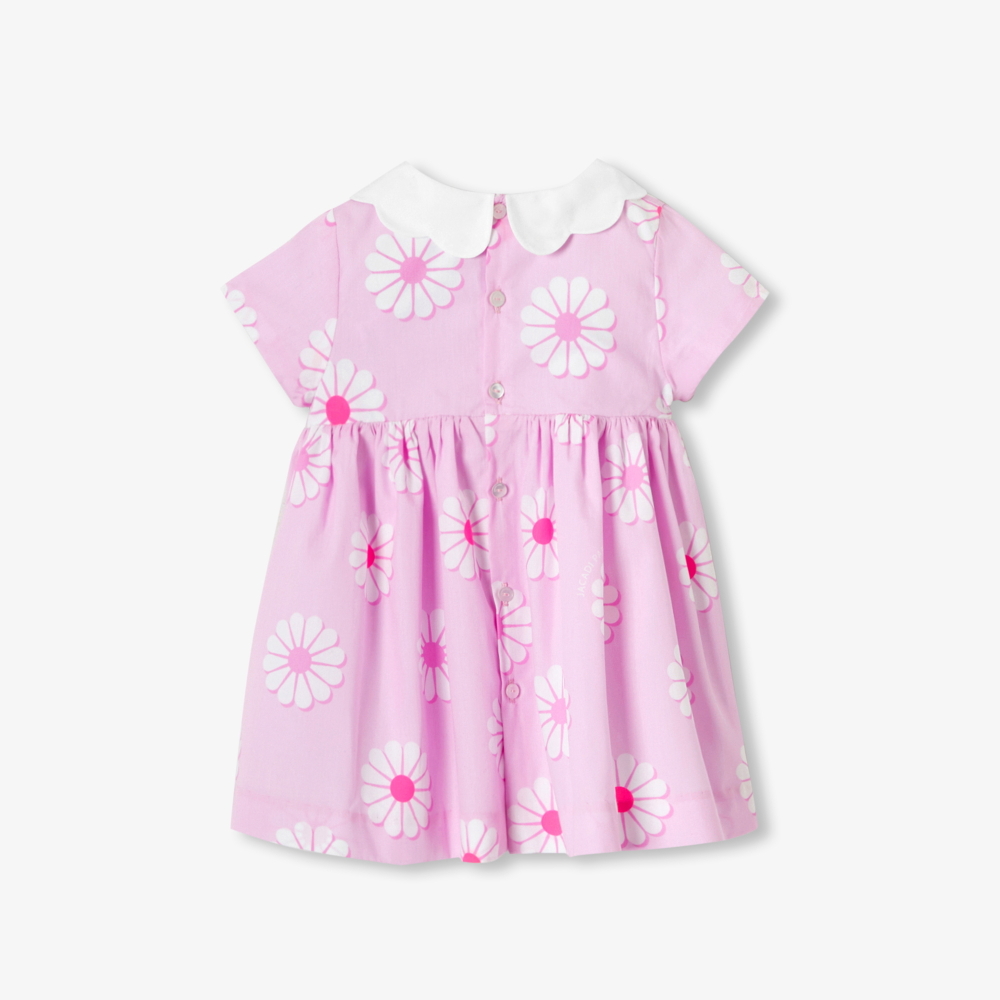 Yumuşak tonlar ve büyük papatya desenleriyle tasarlanan bu bebek kız elbise, zarif ve neşeli bir stil sunar. Fırfır detaylı poplin yakası ve büzgülü bel kesimi sayesinde hafif ve rahat bir silüet oluştururken, günlük kullanım için şık bir alternatif haline gelir.