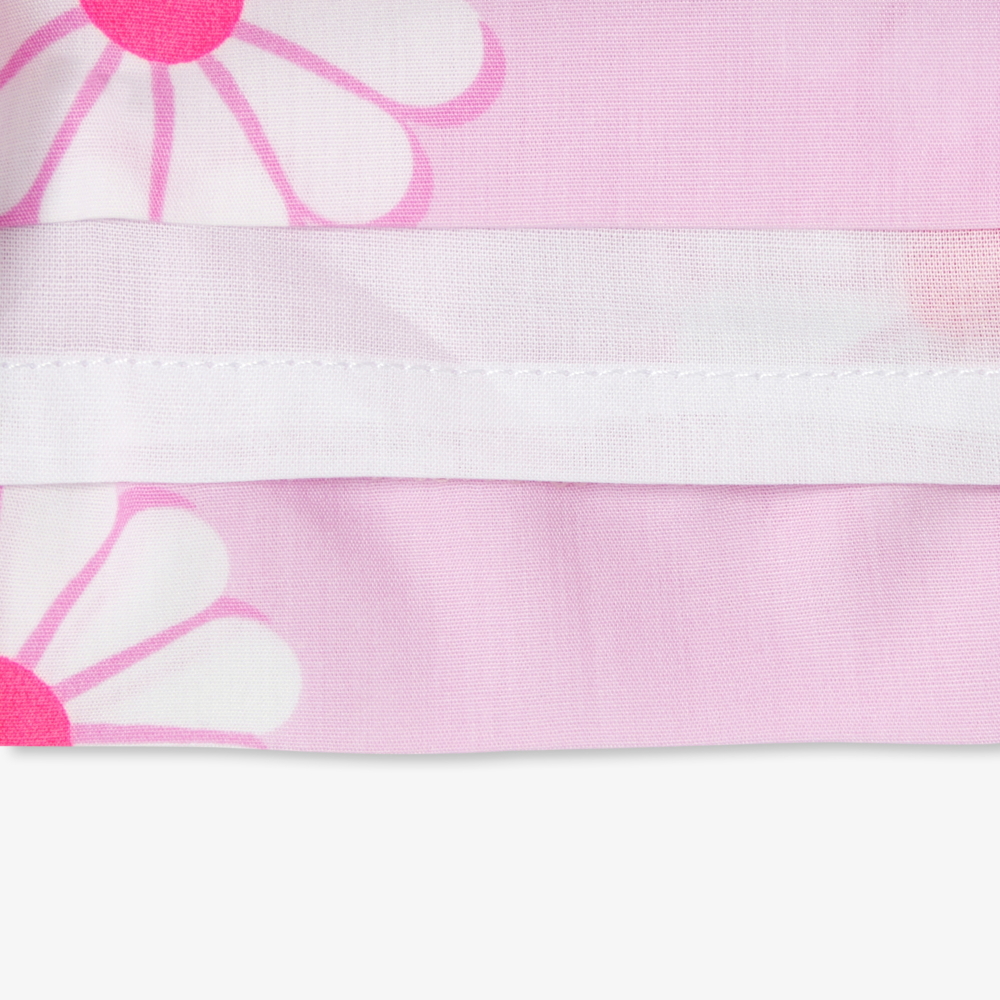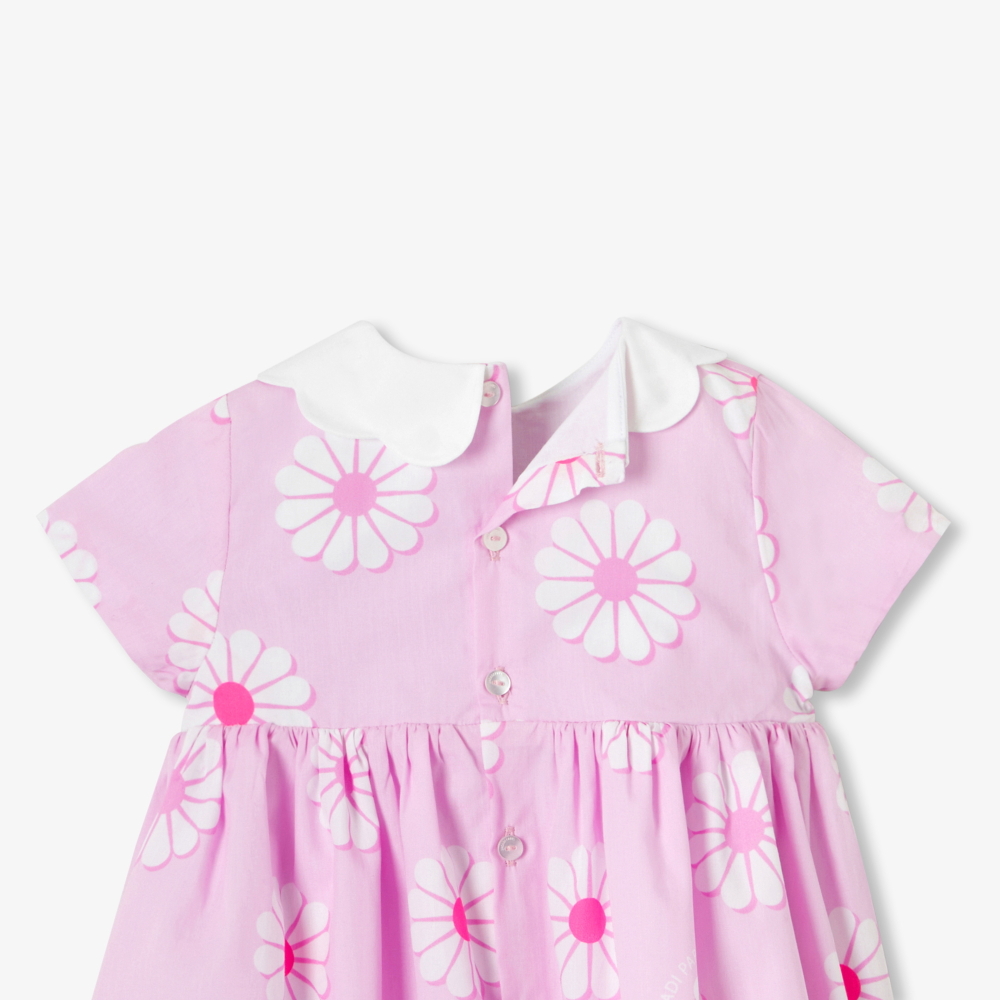 Yumuşak tonlar ve büyük papatya desenleriyle tasarlanan bu bebek kız elbise, zarif ve neşeli bir stil sunar. Fırfır detaylı poplin yakası ve büzgülü bel kesimi sayesinde hafif ve rahat bir silüet oluştururken, günlük kullanım için şık bir alternatif haline gelir.