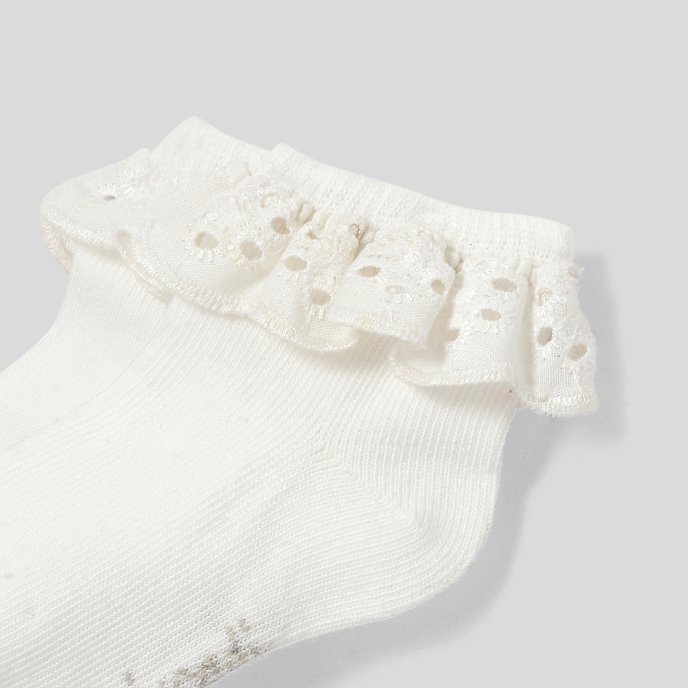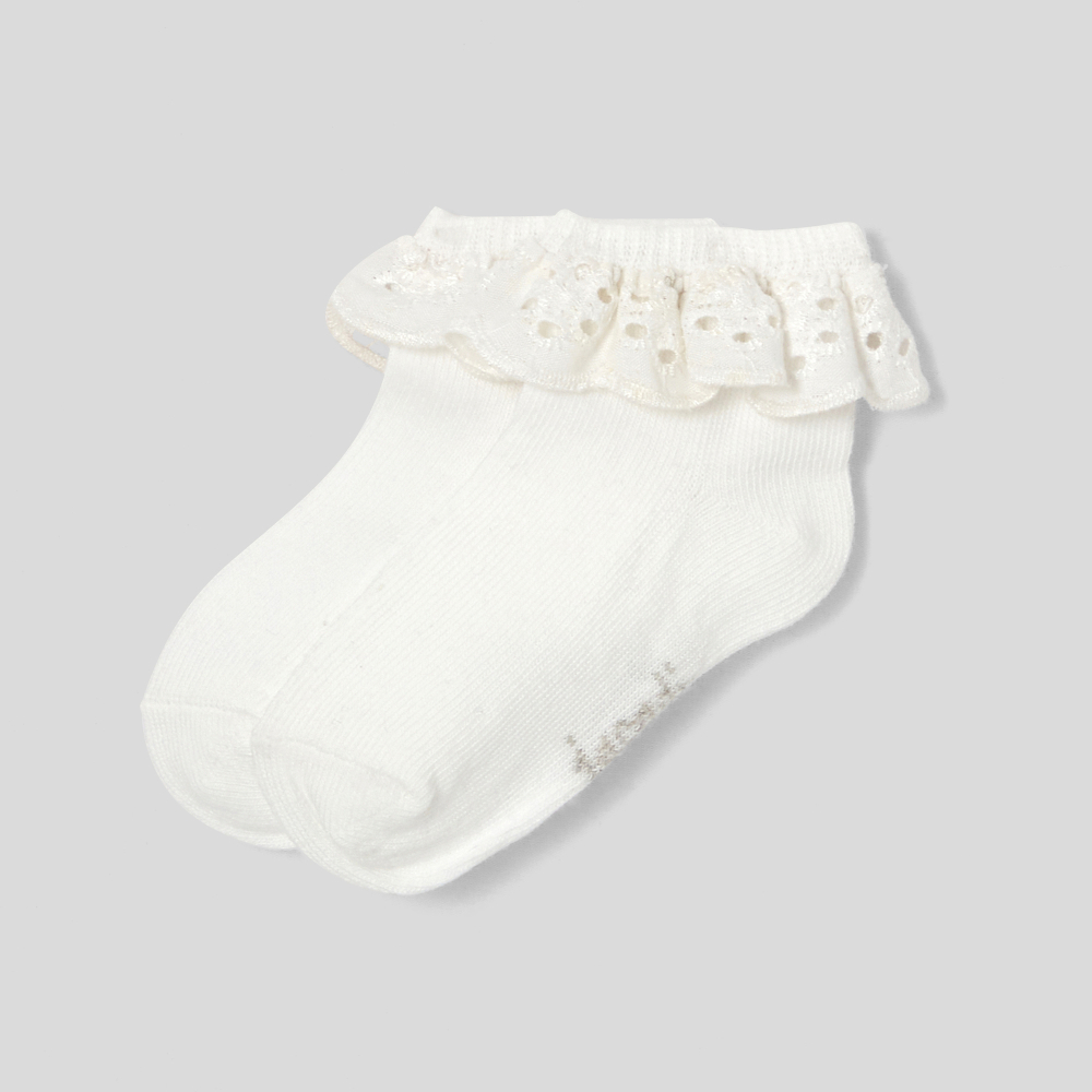 Nakışlı pamuk kumaş üzerinde güzel bir fırfır ile süslenmiş bu çoraplar, her bir kıyafeti zarif bir şekilde tamamlayacaktır. Yumuşak ve esnek organik pamuktan üretilmiş bu çorapları özel gün elbiseleri ve t-bar tarzı ayakkabılarla kombin edebilirsiniz.