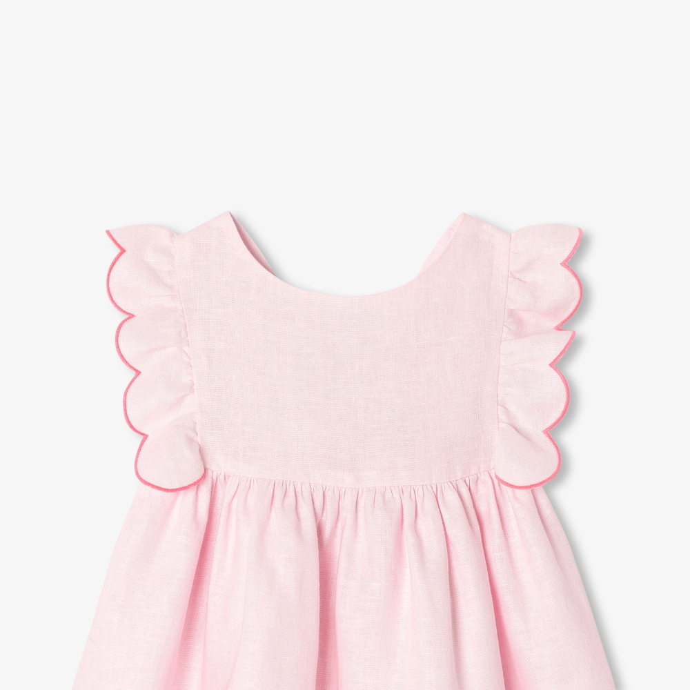 Pastel pembe keten kumaşıyla tasarlanan bu bebek elbise, zarif detayları ve konforlu yapısıyla yaz günleri için idealdir. Dalgalı formda fırfırlı göğüs paneli ve kontrast biye detaylarıyla öne çıkan model, büzgülü bel kesimiyle hafif ve şık bir silüet sunar. Uyumlu bloomer ile birlikte sunulan bu tasarım, yaz boyunca konforlu ve zarif bir kullanım sağlar.