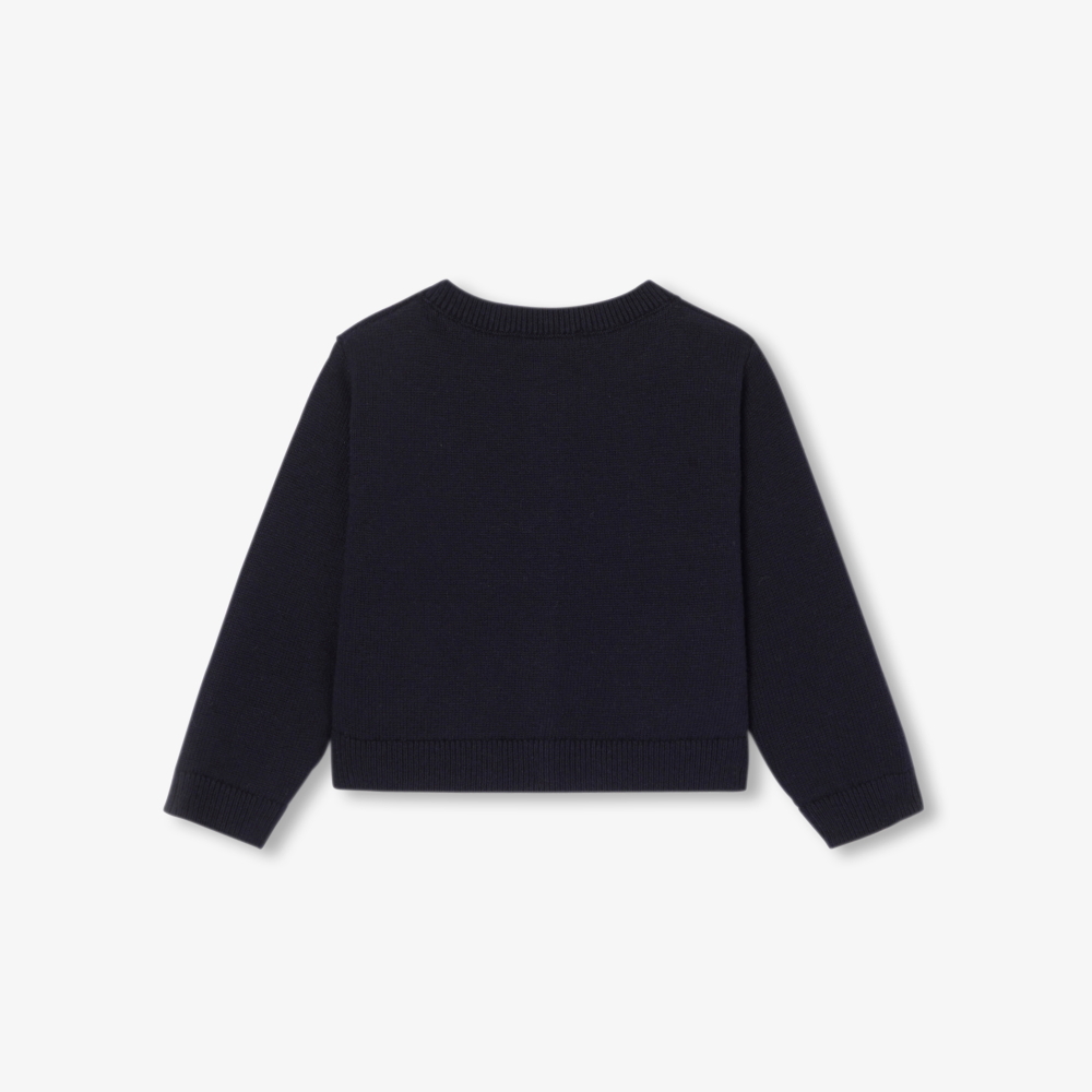 Kız bebek hırkası, biraz daha dolgun kare silüetiyle tanınan kutu kesiminden ilham alan yeni bir kesime sahip. Elbise veya bluz üzerine günlük kullanım için tasarlanan bu model, Jacadi koleksiyonuyla kolayca uyum sağlayan düz renklerde mevcuttur.