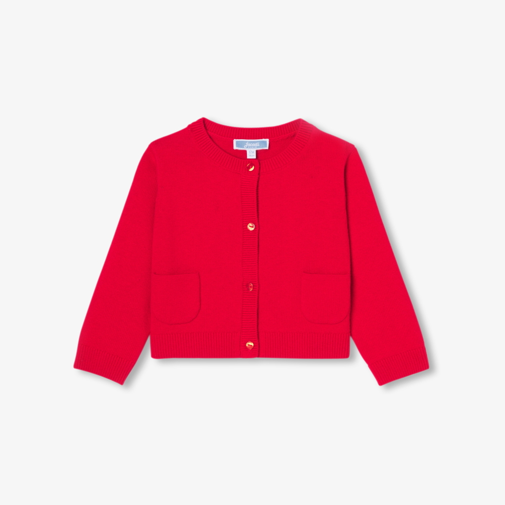 Kız bebek hırkası, biraz daha dolgun kare silüetiyle tanınan kutu kesiminden ilham alan yeni bir kesime sahip. Elbise veya bluz üzerine günlük kullanım için tasarlanan bu model, Jacadi koleksiyonuyla kolayca uyum sağlayan düz renklerde mevcuttur.