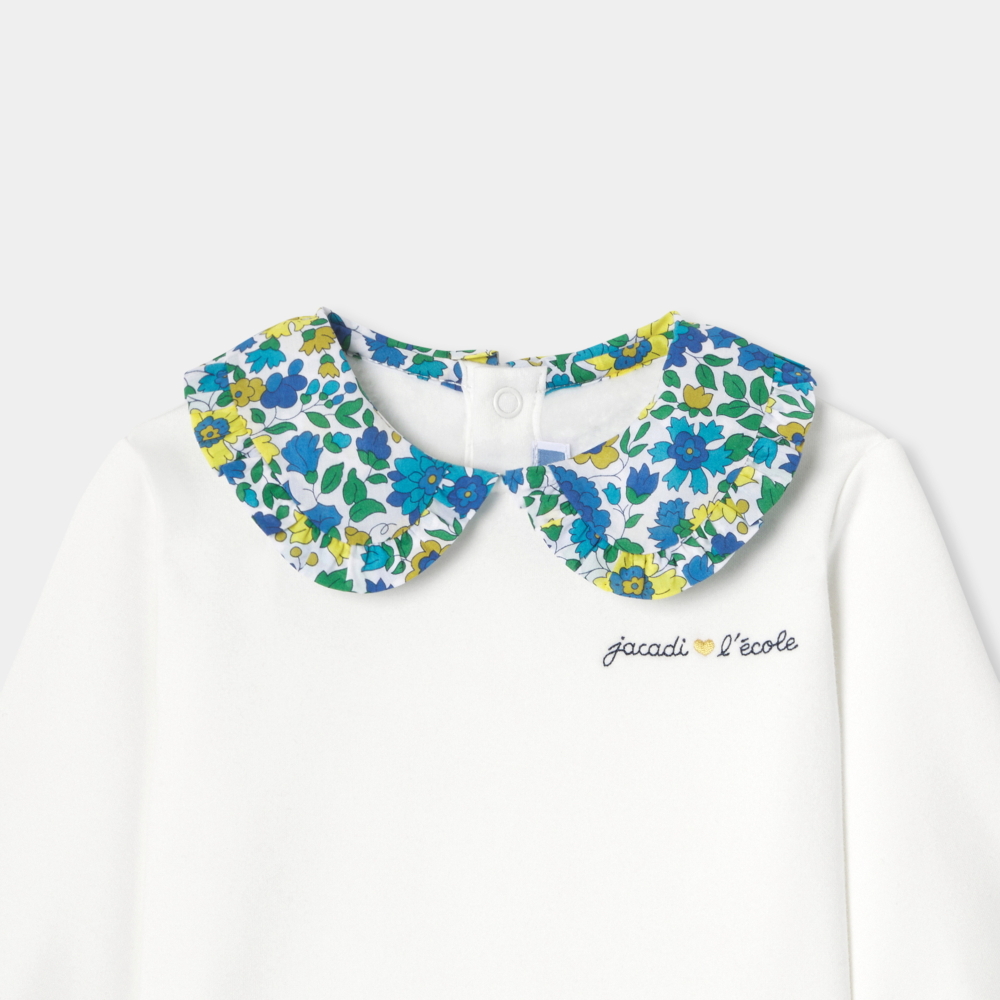 Bu kız bebek sweatshirt, Liberty kumaştan yapılmış Peter Pan yakasının romantik cazibesini yumuşak polar kumaşın rahatlığıyla birleştiriyor. Günlük stiller için olmazsa olmaz olan bu kazağı, sırtındaki çıtçıtlar sayesinde kolayca giyebilir ve sonbaharda şort veya jean pantolonlarla kombinleyebilirsiniz.