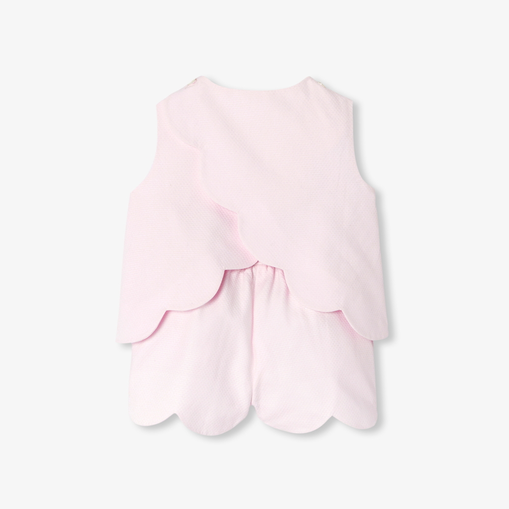 Jacadi’nin zarif stil anlayışıyla tasarlanan bu kız bebek özel gün takımı, petek dokulu pamuk pike kumaşıyla şıklığı ve konforu bir araya getirir. Dalgalı yakalı ve çapraz sırt tasarımlı üst ile dalgalı paça detaylı şorttan oluşan bu couture esintili ikili, yaz davetleri ve özel anlar için zarif bir seçim sunar.