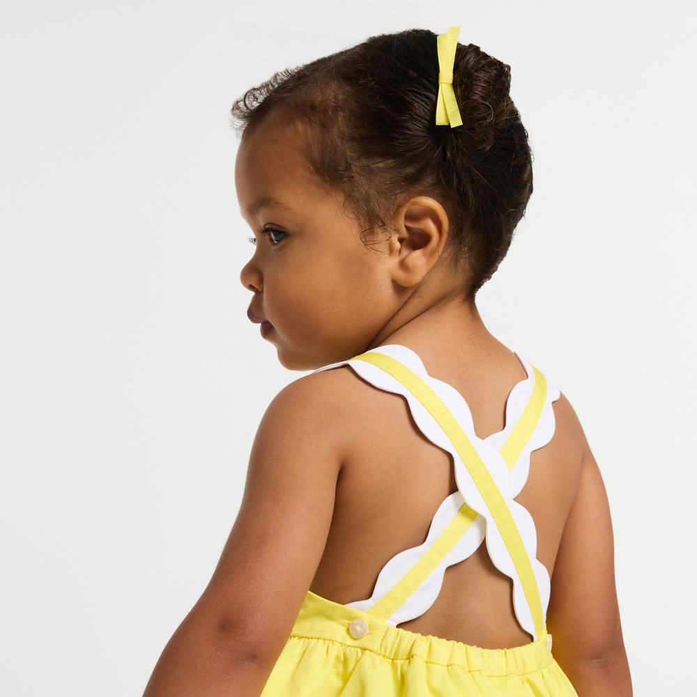 Jacadi, özel günler için zarafet ve inceliği bir araya getiren tasarımlar sunar. Pamuk poplin kumaştan hazırlanan bu kız bebek elbise, çapraz sırt tasarımına sahip dalgalı askıları ve kontrast dalgalı etek ucu detayıyla geometrik ve modern bir siluet oluşturur. Uyumlu lastikli bebek şortu ile tamamlanan bu şık model, büyük günlerde zarif bir görünüm sunar.