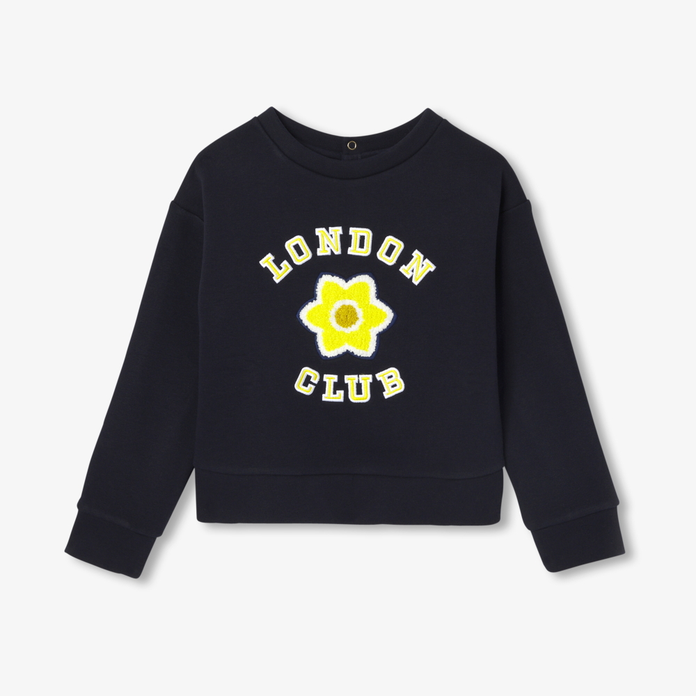 Rahat ve şık bu kız çocuk sweatshirt bu sezon olmazsa olmazlardan. Fırçalanmış polar kumaştan üretilen buklet çiçek rozeti ve "London Club" yazısı, kadife etek veya bol paça jean pantolonlarla kombinlenerek şık bir kolej silüeti yaratabileceğiniz bu modele enerji katıyor.