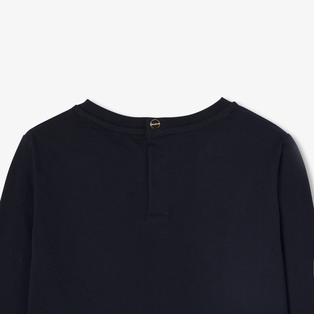 Bu klasik kız çocuk uzun kollu tişört, nakışlı nergis çiçeği ve sarı yazı detayıyla preppy stiline katılıyor. Yumuşak pamuk kumaştan üretilmiş ve kolay giyilip çıkarılabilen model, İngiliz kolej tarzını yansıtan temel bir parça olarak, kot ve hırka ile günlük kullanım için idealdir.
