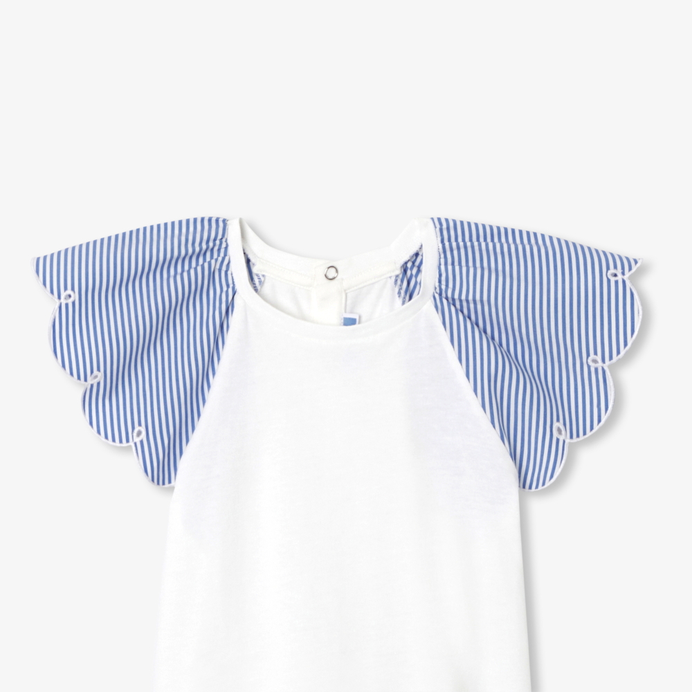 Pamuk jersey kumaşın konforunu, çizgili poplin kumaştan dalgalı kolların zarafetiyle buluşturan bu kız çocuk t-shirt, modern sahil stilini incelikli bir yorumla yansıtıyor. Baskılı geniş paça pantolonlarla ya da desen oyunları yaratmak için Liberty kumaş şortlarla kolayca kombinlenebilen bu model, ilkbahardan yaza uzanan dönemde gardırobun çok yönlü ve şık parçalarından biri oluyor.