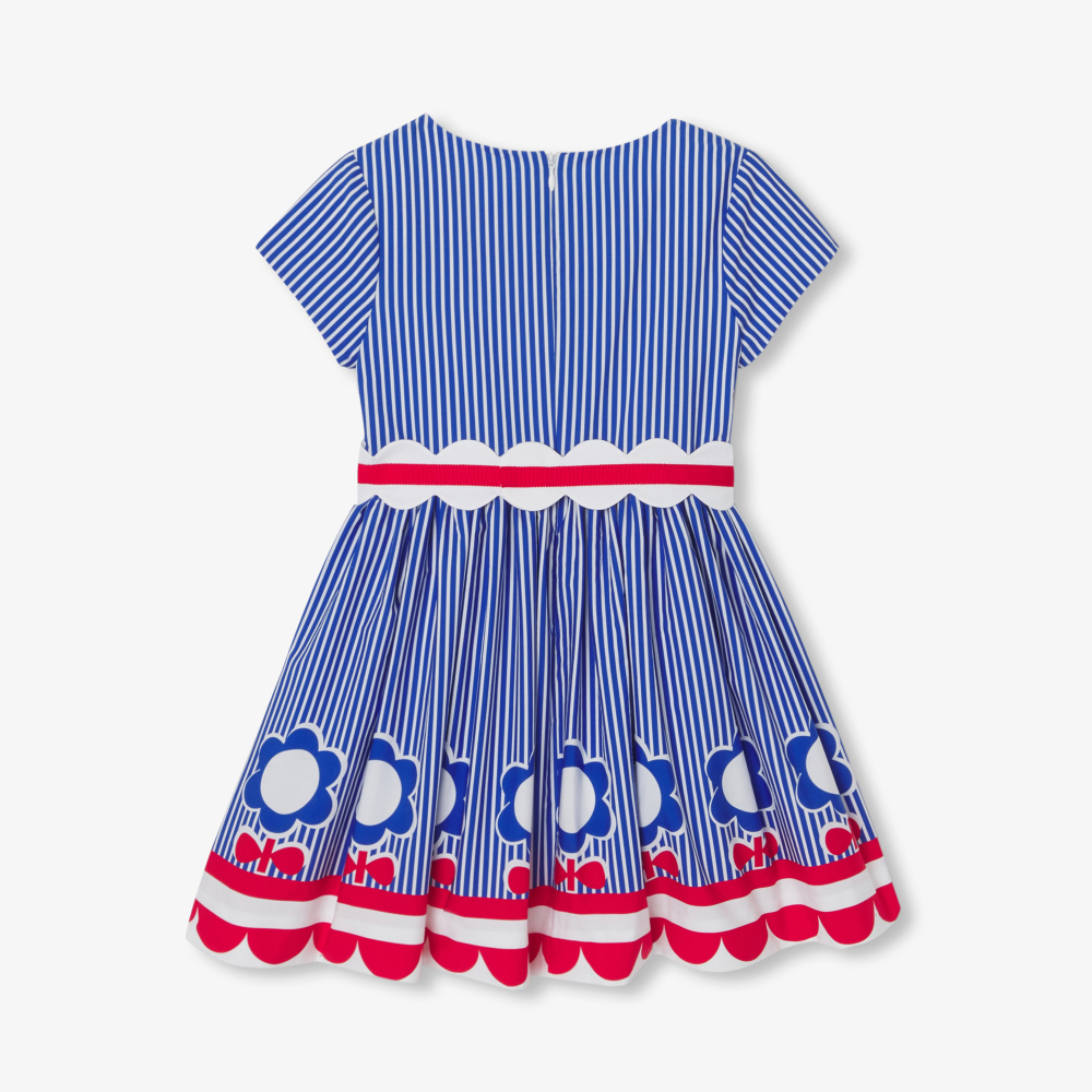 Bu sezonun favorisi olan kız çocuk poplin elbise, geometrik çizgiler ile tekrarlayan çiçek desenlerini, zarif kıvrımlı kenar detaylarıyla buluşturuyor. Jacadi’nin ustalığını yansıtan çıkarılabilir dekoratif kemer ve pamuk astarı, siluete hem yapı hem de hacim kazandırıyor. Yaz ortasında sandaletlerle kombinlenebilecek, büyüleyici bir parça.ı