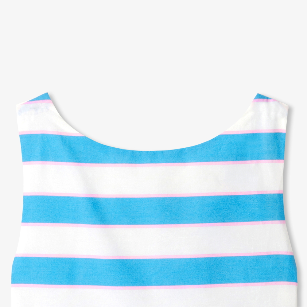 Canlı ve neşeli bir yaz ruhunu yansıtan bu kız çocuk elbise, kontrast çizgileri ve özenle tasarlanmış detaylarıyla dikkat çekiyor. Modern bir silüete sahip olan bu tasarım; arkada çapraz askıları, beli hafif büzgülü yapısı ve kalp formundaki cepleriyle görünümüne zarif ve oyunbaz bir hareket katıyor. Enerjik yaz günlerine eşlik edecek bu elbise, çağdaş çizgisiyle gardırobun öne çıkan parçalarından biri oluyor.