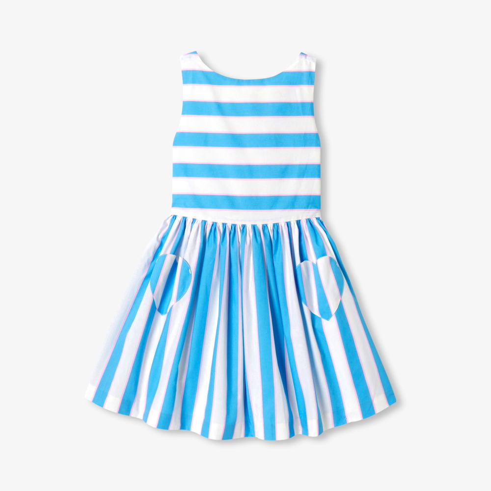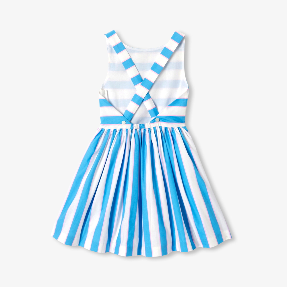 Canlı ve neşeli bir yaz ruhunu yansıtan bu kız çocuk elbise, kontrast çizgileri ve özenle tasarlanmış detaylarıyla dikkat çekiyor. Modern bir silüete sahip olan bu tasarım; arkada çapraz askıları, beli hafif büzgülü yapısı ve kalp formundaki cepleriyle görünümüne zarif ve oyunbaz bir hareket katıyor. Enerjik yaz günlerine eşlik edecek bu elbise, çağdaş çizgisiyle gardırobun öne çıkan parçalarından biri oluyor.