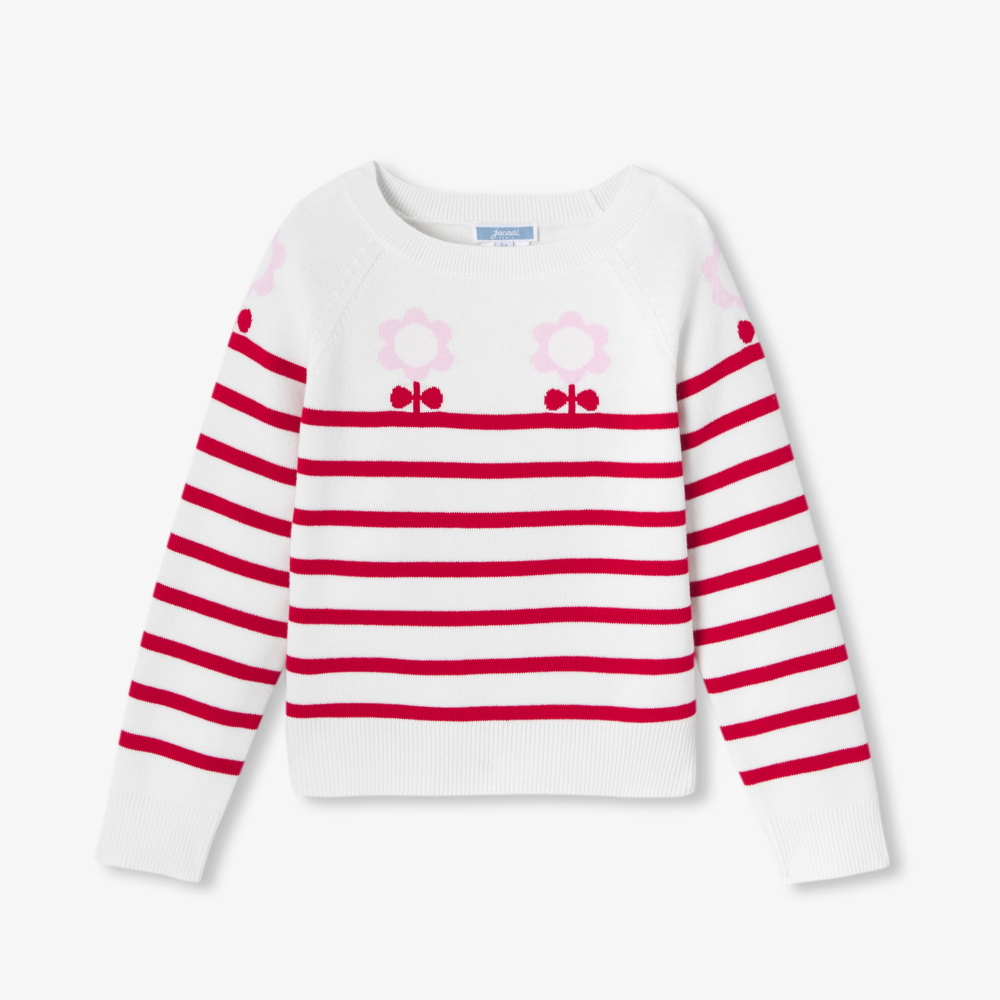 Klasik denizci stilinin modern bir yorumu olan bu kız çocuk triko kazak, zamansız denizci mirasını çağdaş bir tasarımla buluşturur. Çizgili jarse örgü yapısı ve ön yüzündeki intarsia çiçek motifi tasarıma sofistike bir feminen dokunuş katar. Jean ya da eteklerle kolayca kombinlenebilen bu parça, Paris şıklığını günlük stile zahmetsizce taşır.