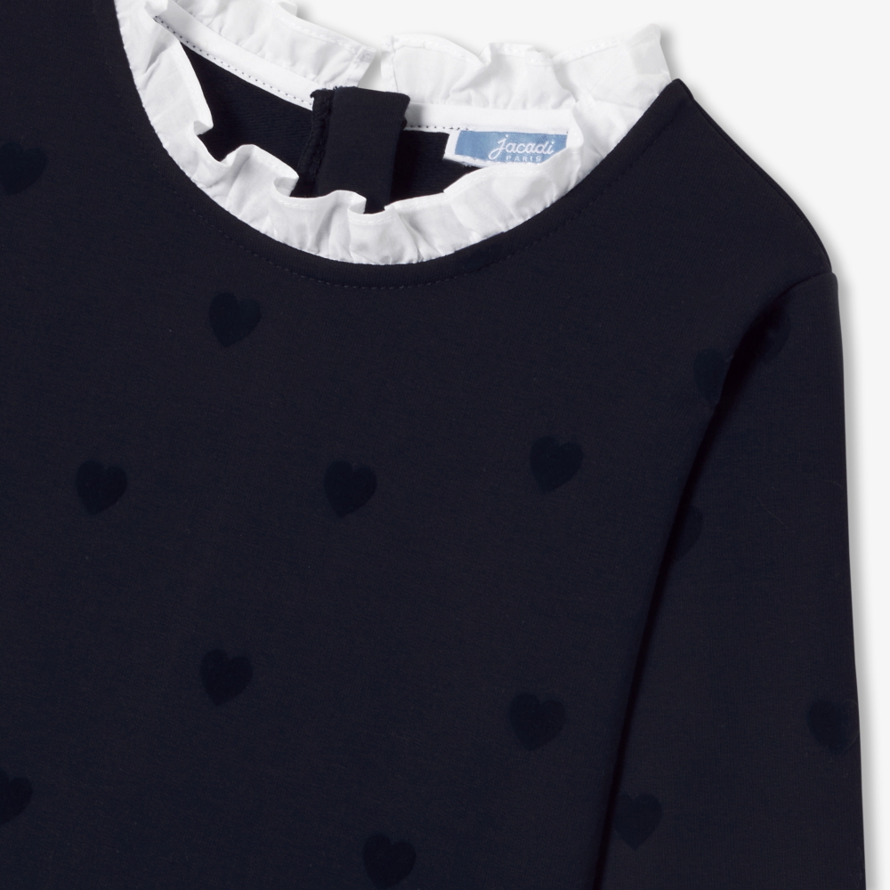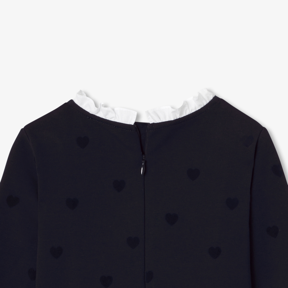 Retro-şık ve geometrik çizgilere sahip bu kız çocuk elbise, sezon başı için ton sür ton küçük kalplerle süslenmiş modern organik pamuklu fleece kumaştan üretilmiştir. Poplin fırfırlı yaka ve beldeki kesim detayıyla hem şık hem de rahat olan model, okul günlerinde favori ayakkabılarla mükemmel uyum sağlar.