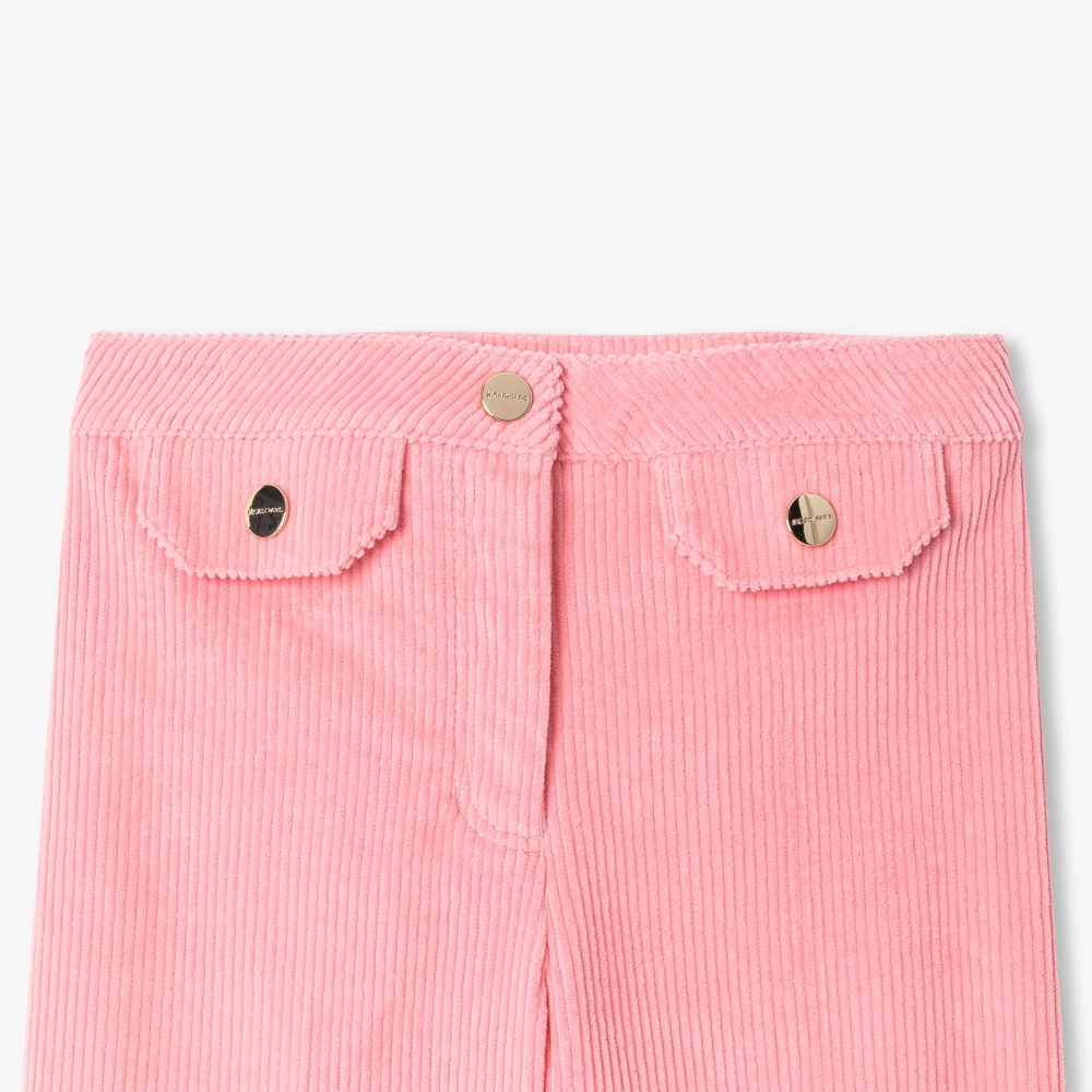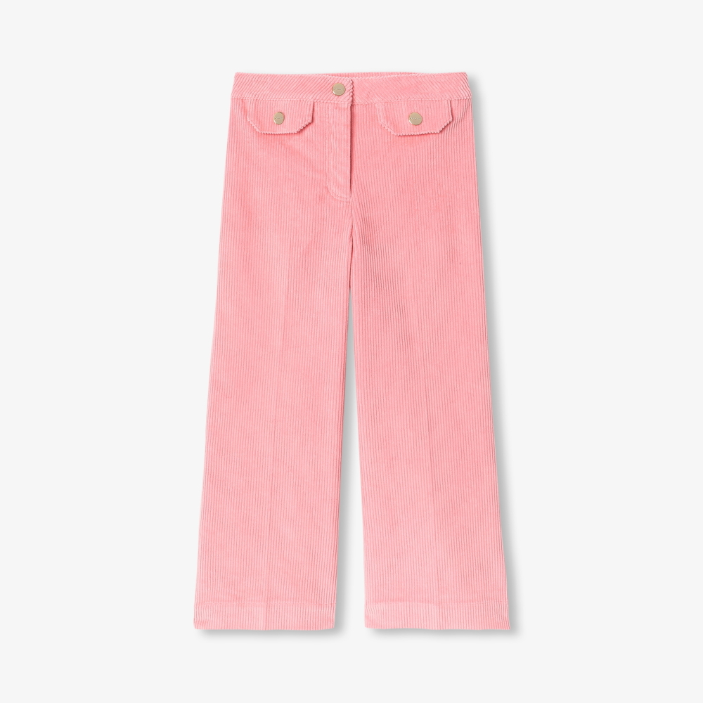 Yumuşak ve konforlu kadifeden üretilen bu şakayık pembe, geniş paçalı kız çocuk pantolonu modern bir siluet sunar. Kapaklı cepleri ve belirgin pile detaylarıyla retro bir şıklık kazanan bu model, sonbahardan kışa uzanan dönemde kazak ve spor ayakkabılarla kombinlenerek Paris esintili zarif bir görünüm yaratır.