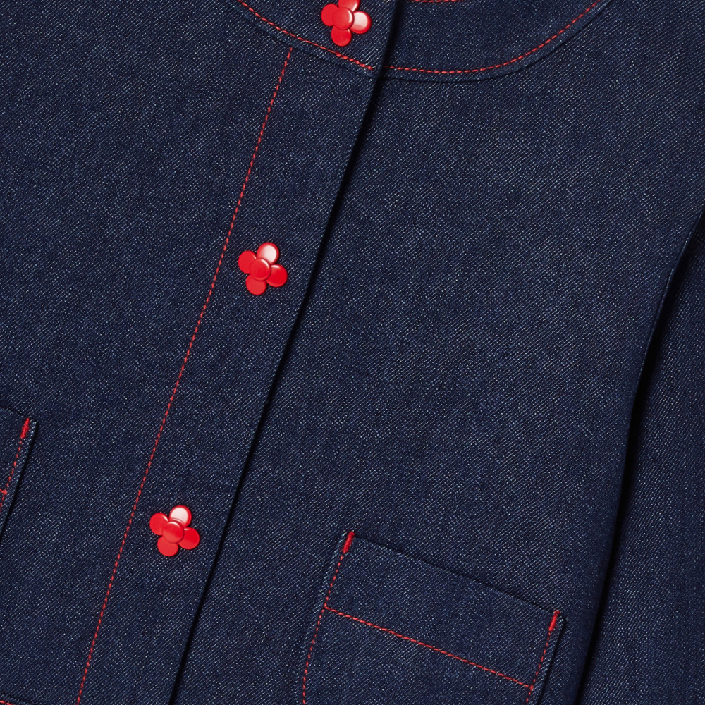 Şehir stilini modern bir couture dokunuşla yeniden yorumlayan bu kız çocuk ham denim ceket, Fransız zarafetinden ilham alan detaylarıyla öne çıkar. Düz kesimi ve yuvarlak yakası modern bir siluet sunarken, kırmızı kontrast dikişleri ve çiçek formundaki düğmeleri tasarıma sofistike bir karakter kazandırır. Uyumlu elbisesi ya da jean pantolonlarla birlikte zahmetsizce kombinlenebilen, zamansız ve şık bir parça.