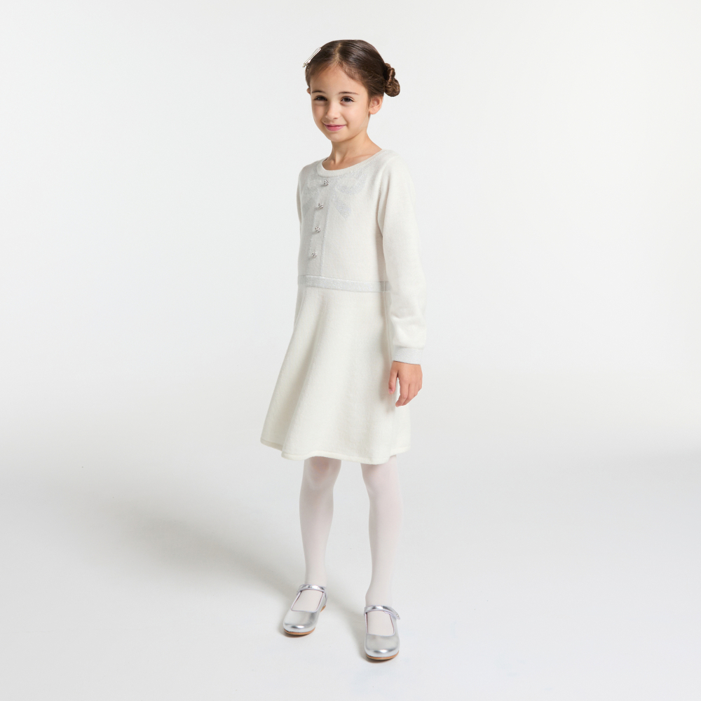 Jacadi tasarımcıları bu sezon kış elbisesini yeniden yorumlayarak modern ve geometrik bir şıklık sunuyor. Sürdürülebilir yün ve kaşmir karışımından üretilen bu özel parça; trompe-l’œil etkili gümüş intarsia fiyonk detayı, belirgin bel hattı ve hafif kloş eteğiyle couture tarzını yansıtır. Külotlu çorap ve botlarla tamamlandığında yılbaşı sezonu için mükemmel bir görünüm oluşturur.