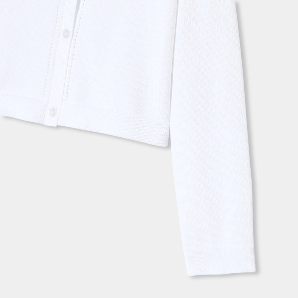 Jacadi'nin tören elbiseleri koleksiyonunu sergilemek için kısa kesilmiş bu kız çocuk hırkası organik pamuktan yapılmıştır. Ajurlu kollar ve düğme iliklemesiyle, büyük günde kıyafetine mükemmel bir son dokunuş katar.