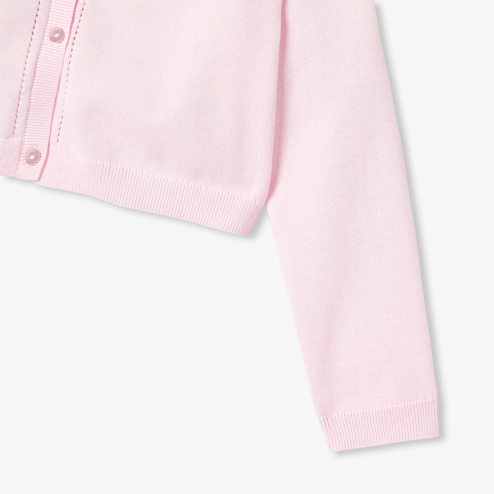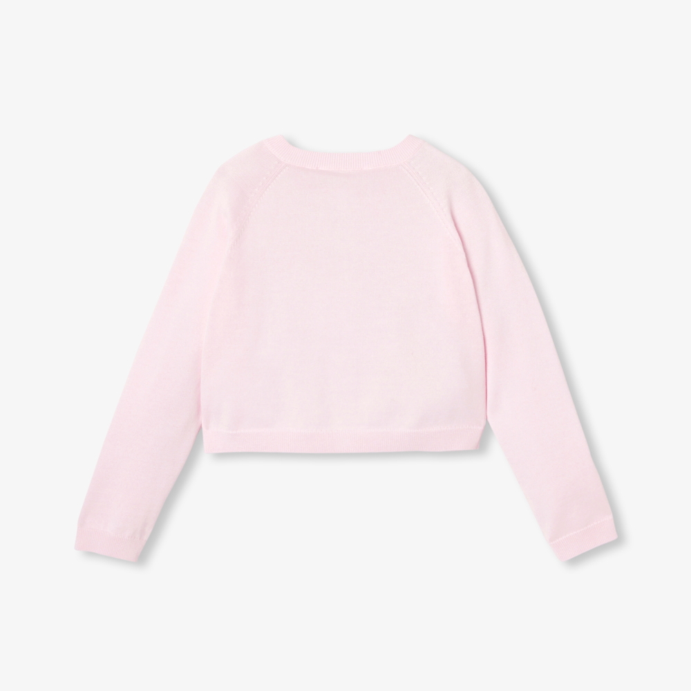Jacadi'nin özel gün elbiseleri koleksiyonunu sergilemek için kısa kesilmiş bu kız çocuk hırkası organik pamuktan yapılmıştır. Ajurlu kollar ve düğme iliklemesiyle, büyük günde kıyafetine mükemmel bir son dokunuş katar.
