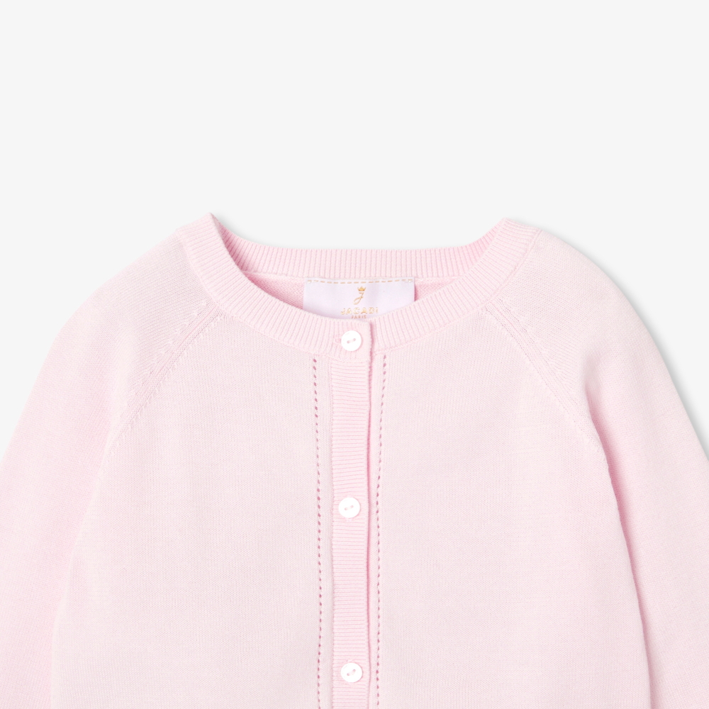 Jacadi'nin özel gün elbiseleri koleksiyonunu sergilemek için kısa kesilmiş bu kız çocuk hırkası organik pamuktan yapılmıştır. Ajurlu kollar ve düğme iliklemesiyle, büyük günde kıyafetine mükemmel bir son dokunuş katar.