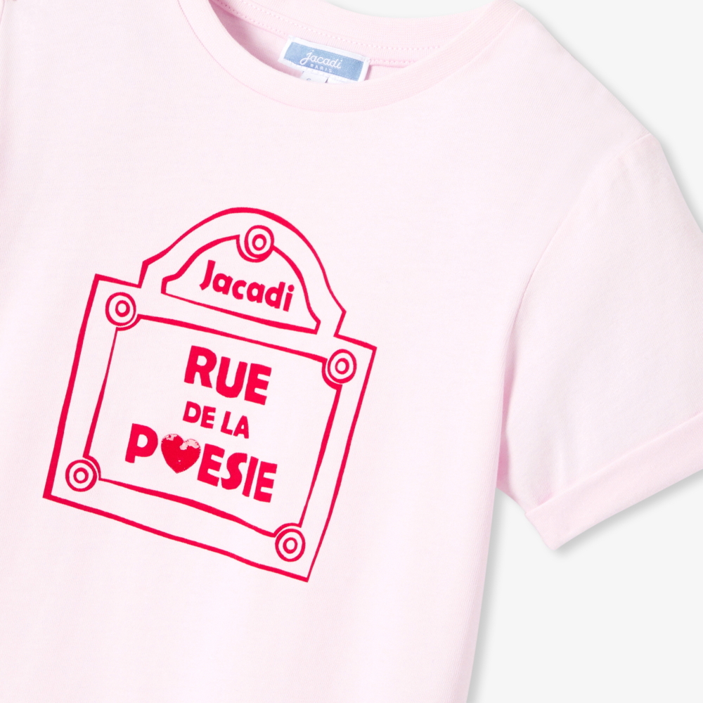Organik pamuk jarse kumaştan üretilen bu kız çocuk tişört, ön yüzündeki flok baskı sokak tabelası motifiyle Paris sokaklarında keyifli bir gezintiye çıkarıyor. Fransız zarafetini günlük stile taşıyan bu zamansız parça, sade görünümlere modern ve şık bir dokunuş katmak için ideal.