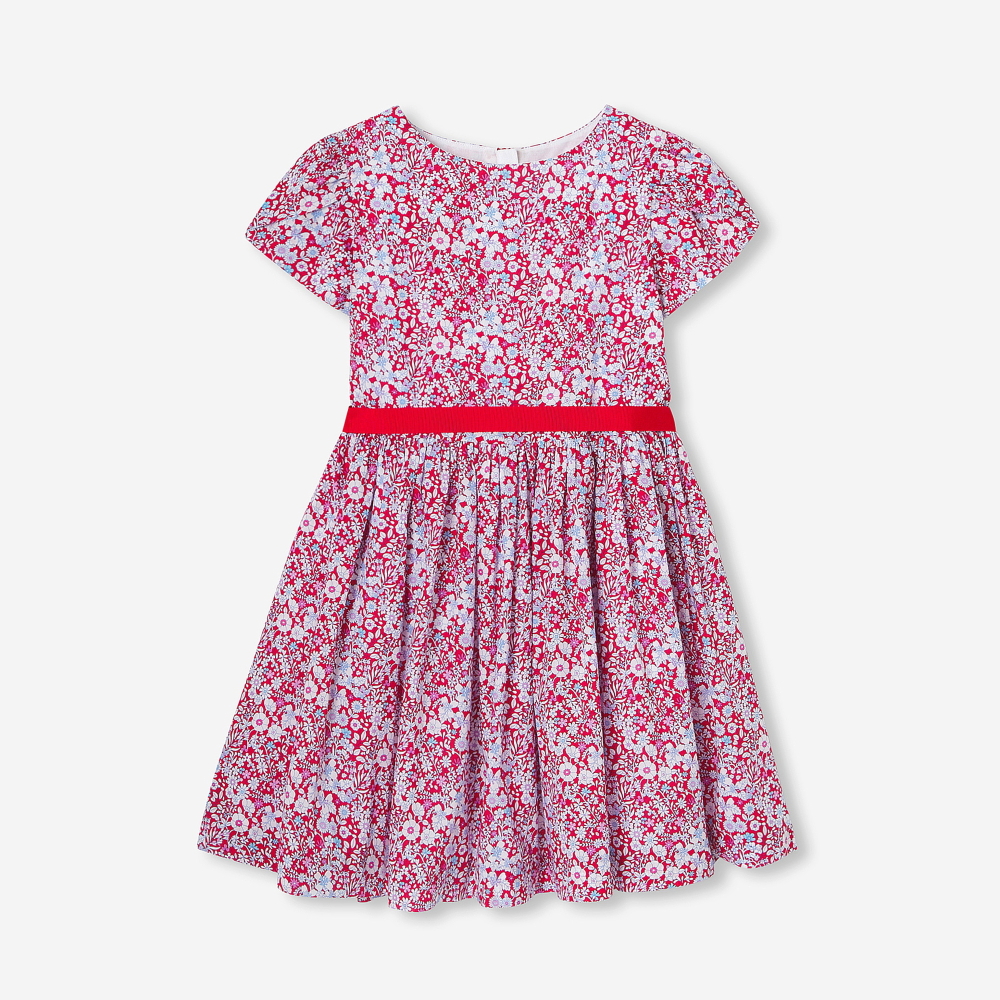 Geometrik deseni ve zarif detaylarıyla öne çıkan bu Liberty kumaş kız çocuk elbisesi, modern şıklığı rafine bir zarafetle buluşturur. Hafif ve dökümlü lale formundaki kısa kolları elbiseye feminen bir hava katarken, bel kısmındaki kırmızı grogren kemer silueti zarifçe vurgular. Tamamı pamuk astarlı yapısı sayesinde hacmi dengeler ve gün boyu konfor sunar. Şehir gezmeleri ve özel davetler için ideal, şık ve çağdaş bir görünüm yaratır.