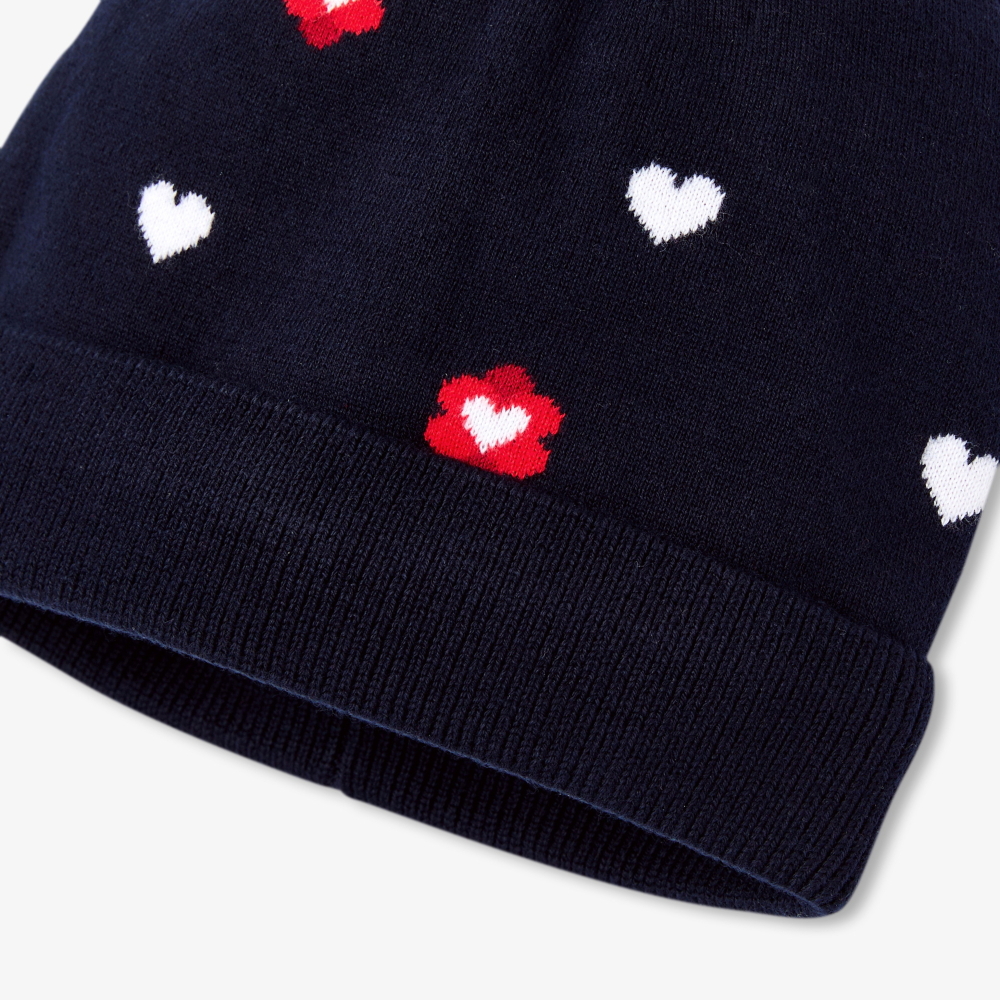 Kırmızı çiçekler ve beyaz kalplerle süslenmiş lacivert pamuklu bu kız çocuk beresi, Fransız dokunuşuyla şık bir kışı müjdeliyor. Mikro polar astarlı ve ponponlu bu bere, uyumlu boyunlukla birlikte kullanıldığında başınızı ve mevsime uygun görünümünüzü ısıtacak.