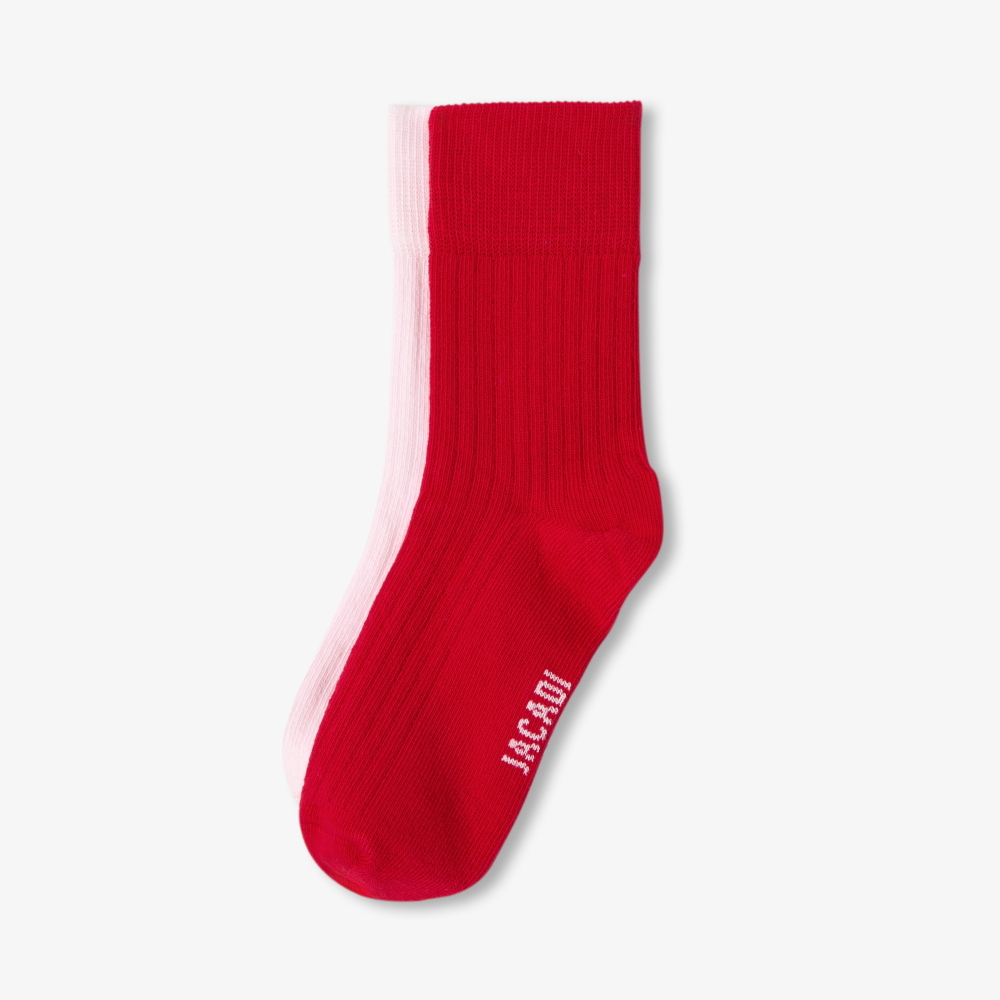 Canlı kırmızı ve pastel pembe renk seçenekleriyle sunulan bu kız çocuk çoraplar, günlük kombinlerin şık tamamlayıcısıdır. Geniş düz fitilli dokusuyla hem konfor hem de zarif bir görünüm sunan model, Mary Jane ayakkabılar, şortlar veya eteklerle kombinlenerek preppy ve renkli bir stil oluşturur.