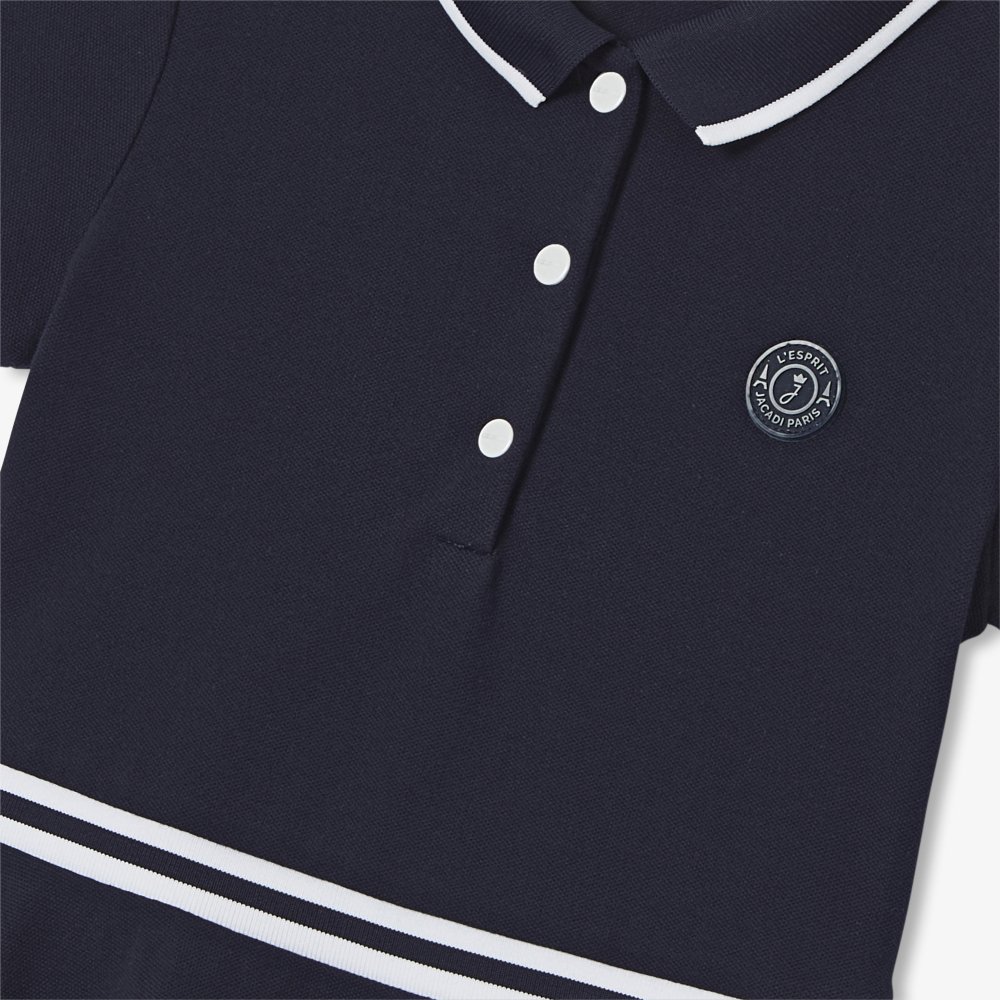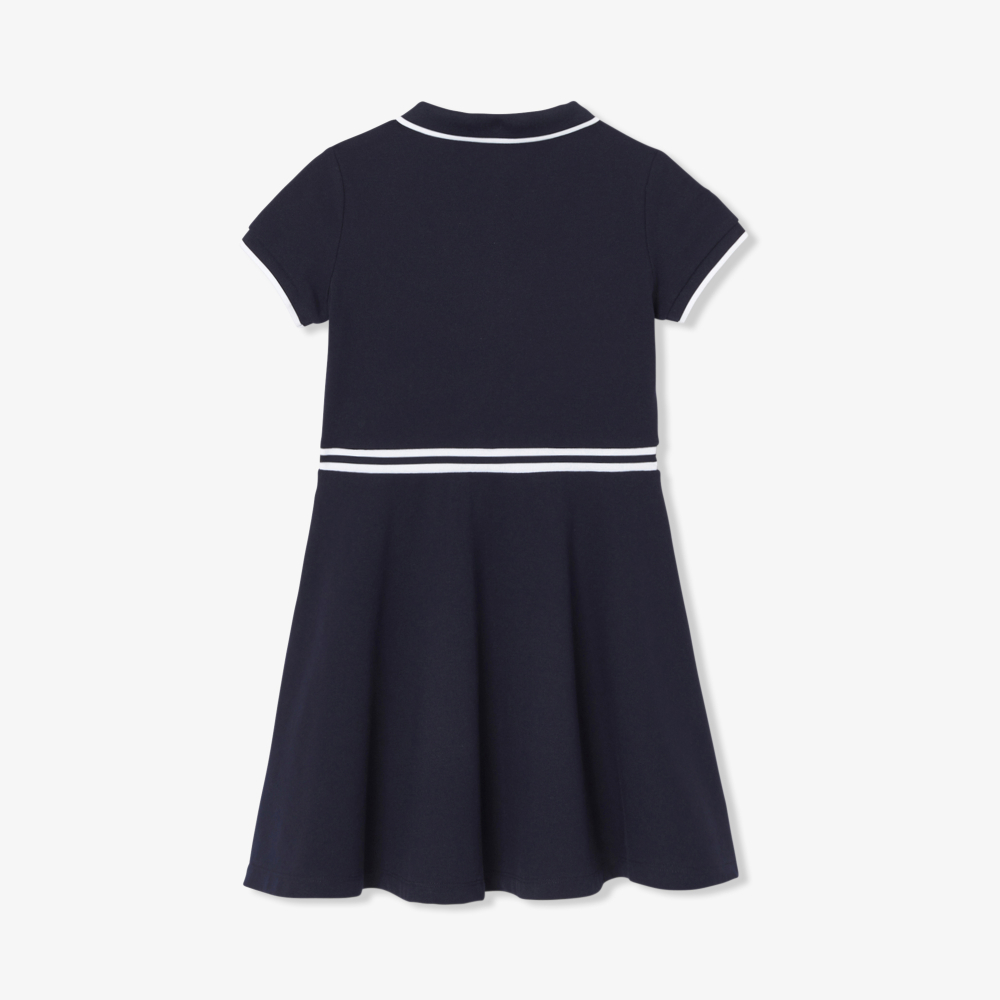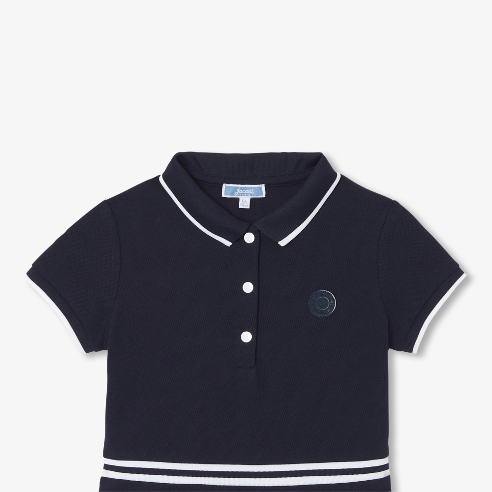 Tenis elbisesinden esinlenerek polo yakası ve kontrast detaylarıyla bu pike örgülü kız çocuğu elbisesi sizi sezon boyunca zarafetle taşıyacak. Renk bloklu veya düz, spor ayakkabı veya sandaletlerle giyilebilir, kızınızın okula kadar onu takip edecektir.