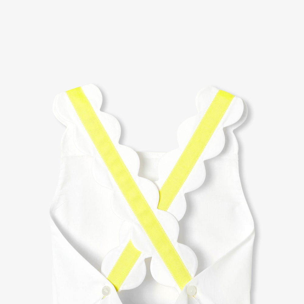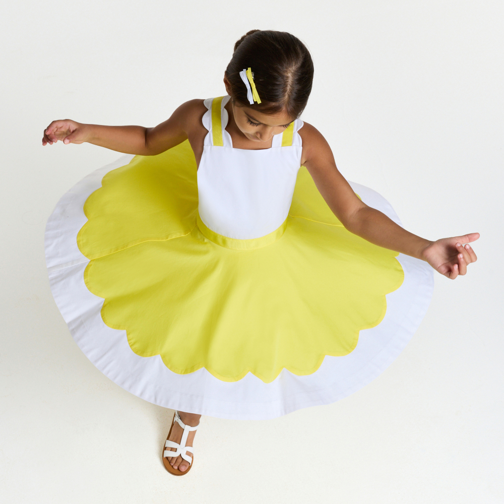 Zarif detayları ve kusursuz işçiliğiyle öne çıkan bu kız çocuk elbisesi, yaz davetleri ve kutlamalar için modern ve şık bir seçenek sunar. İki renkli pamuk saten kumaştan üretilen model, etek ucundaki dalgalı kesim detayı ve sırt kısmındaki çapraz askı tasarımıyla sofistike bir görünüm kazanır. Bel kısmını vurgulayan dokulu kurdele detayı elbiseye zarif bir dokunuş katarken, sandalet ve hırkalarla kombinlenerek özel gün stilini tamamlar.