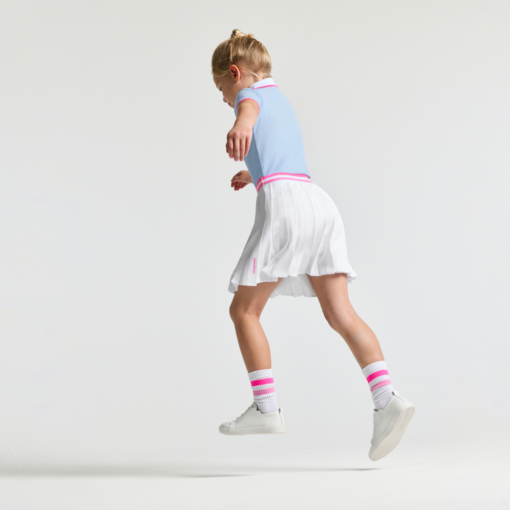 Spor giyimden ilham alan bu kız çocuk pileli etek, çağdaş bir tenis eteği formunda yeniden yorumlandı. Akıcı bir duruş sunan teknik pike örgü kumaştan üretilen model, çizgili lastikli beli ile tasarıma dinamik bir hava katar. Tişört ya da polo tişörtlerle kombinlenerek preppy ve sportif bir görünüm elde edilebilir.