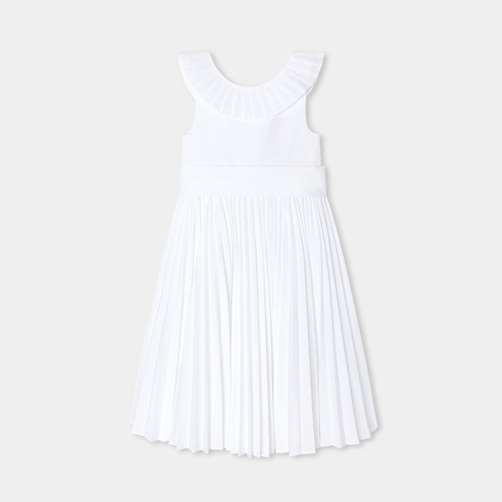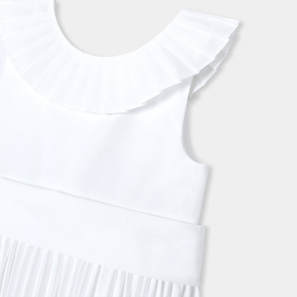 Bu zarif kız çocuk maksi elbisesinde Fransız şıklığını ve Jacadi ustalığını yeniden keşfedin. Özel günler için tasarlanan bu haute couture esintili parça, sırta doğru uzanan pileli fırfır, etek ucunda kalıcı pileler ve geniş, çıkarılabilir grosgrain kemer içerir. Büyük gün için güzel sandaletler ve pembe tafta bir kafa bandıyla eşleştirin.