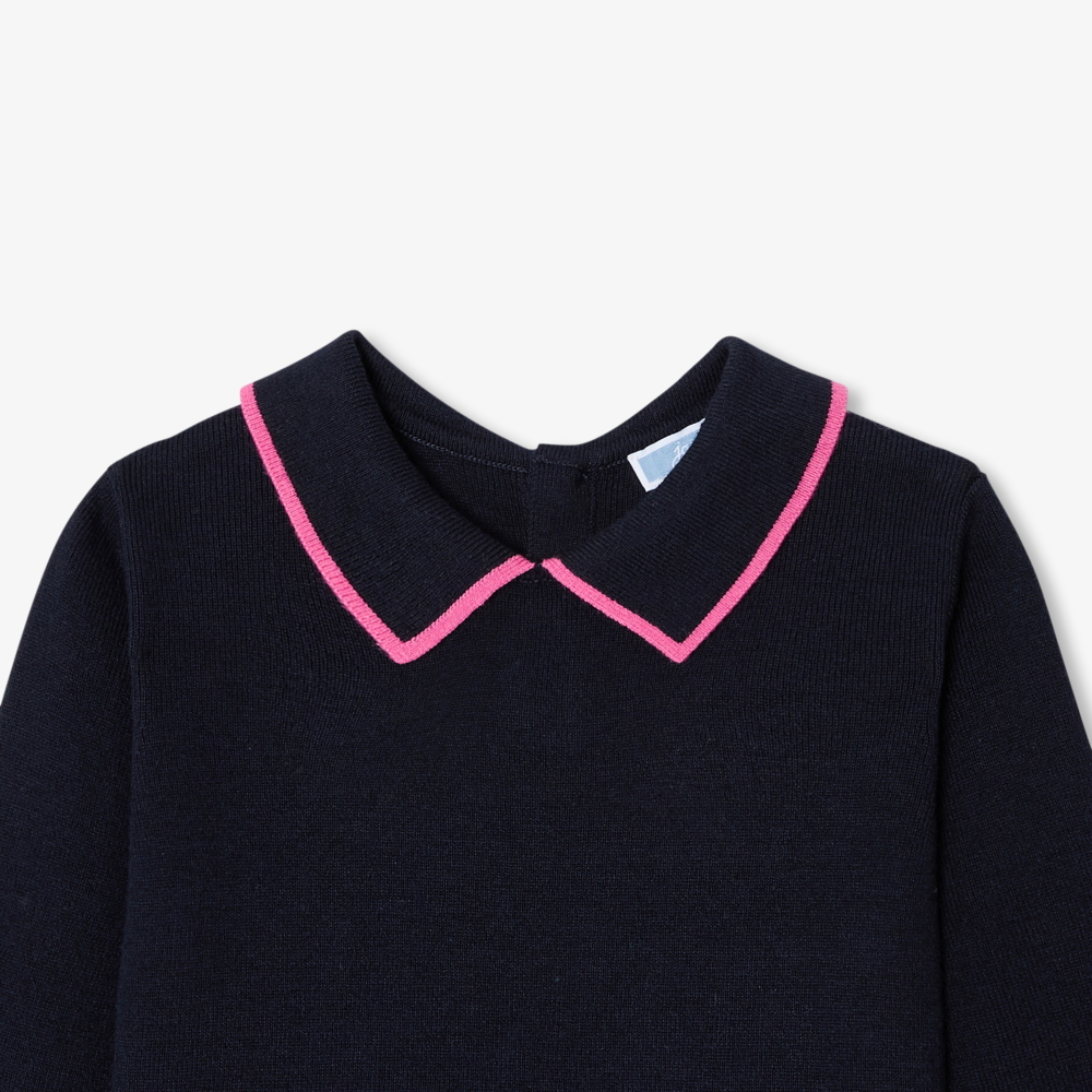 Şık ve modern tasarımıyla öne çıkan bu kız çocuk elbise, Jacadi’nin zarif işçiliğini yansıtır. Pamuk triko ve hafif kaşmir karışımından üretilen model, polo yaka, kontrast kol ucu ve çizgili pileli eteğiyle okul başlangıcında Mary Jane ayakkabılarla mükemmel uyum sağlar.
