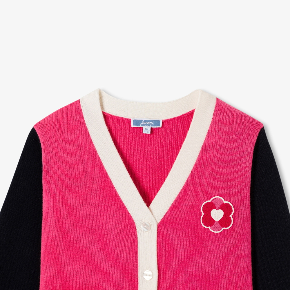 Sezon kombinlerini canlandıran renk bloklu tasarımıyla bu kız çocuk hırka, yumuşak ve esnek triko kumaştan üretilmiştir. V yaka modeli, göğüsteki nakışlı çiçek arma ve patch cepleriyle öne çıkar. Yaka tişört ve geniş paça kotlarla kombinlendiğinde hem sıcak hem de şık bir görünüm sunar.