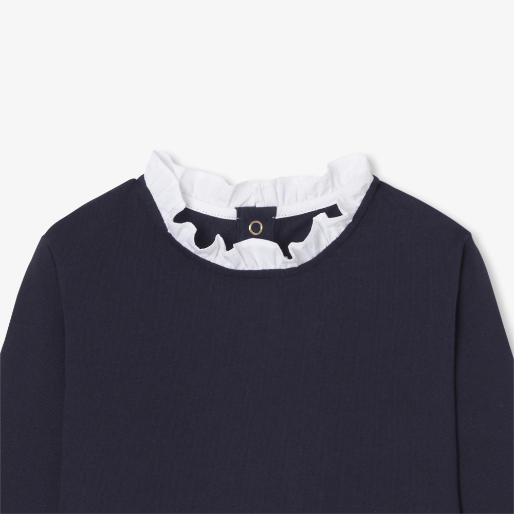 Jacadi, şık ve modern bir tasarım için klasik kız çocuk uzun kollu tişörtünü yeniden yorumluyor. Organik pamuktan üretilen ve düz veya çizgili versiyonları bulunan fırfırlı yaka ve manşetler, okula dönüş gardırobunun olmazsa olmazı olan bu tişörte enerji katıyor.